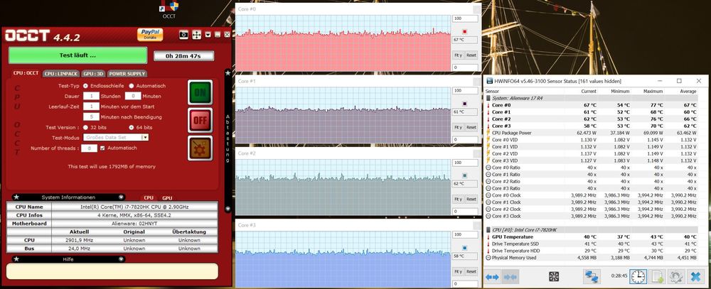 Da hat doch nicht's wirklich was gebracht, Du solltest Dir Deine Werte nicht schön reden. Deine CPU hat deutliches throttling, kann also den Takt nicht halten. Hattest Du auch im Windows Power Management auf "Hochleistung" gestellt und Dein Alienware am Netz? Dann solltest OCCT starten und direkt danach ein Reset von HWiNFO64 machen, damit Du auch nur die Werte während des Belastungstest auslesen kannst. Hast Du ein Voltage Offset eingestellt? Die aktuelle Differenz zwischen den CPU Kernen ist zwar niedrig, jedoch bei Spitzenwerten um 100C°C nähern diese sich meist ohnehin an. Hier zwei Beispiele des I7-7820KH mit stock Paste und Multiplikator 40x je Kern bei einem Voltage Offset von 0.0V und -0.15V beide sehen besser aus als bei Dir aktuell. Ohne einem Voltage Offset. Man Erkennt bei Core#1,2,3,4 Clock, daß das Minimum unter den eingestellten 4GHz liegt, die Abweichung ist jedoch eher gering, da im Average die 4 GHz anliegen. Jetzt mit einem Voltage Offset von -0,15V, nun gibt es kein throttling, der Takt von 4 GHz wird durchgehend gehalten und die Temperaturen sinken Da ich ab und zu ein Abbruch bei einem Voltage Offset von -0.15V hatte bin ich aktuell auf -0,1V in meinem aktuellen Setting. Und das noch ohne Repaste. Meine Empfehlung wäre bitte nicht weiter an der Heatsink biegen oder noch weitere Repaste Versuche unternehmen, mach Dich erstmal richtig schlau wie Du die Stabilität Deiner Settings bewerten mußt und wann man welche Werte einstellt. Du hattest auch bereits einmal geschrieben, daß Du bei einem Voltage Offset eher mehr throttling hattest, da kommt mir die Vermutung, daß Du ggf. einen positiven Voltage Offset eingestellt hattest? Wie auch immer, Du tust Dir einen Gefallen wenn Du Dich erst umfassend schlau machst. Ich hätte Deinen Laptop wohl bei derart hohen Temperaturen direkt Retoure geschickt. Hinter meiner Kritik steckt nur der Wille Dir helfen zu wollen, in diesem Sinne einen schönen Tag -