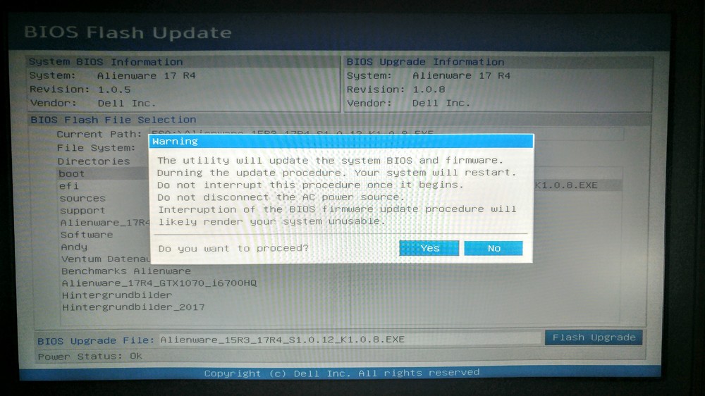 @Angus & All: Ich habe das BIOS Update auf die hier beschriebene Weise für das Alienware 17 R4 mit dem Kabylake i7-7820HK durchführen wollen (1.0.5 zu 1.0.8). Leider ohne Erfolg, im letzten Schritt kann ich das Update bestätigen, danach führt er ohne das Update durchzuführen und ohne Fehlermeldung einen Neustart durch. Uuvor hatte ich die Optionen im BIOS soweit angepasst. Ich hab es zwei mal versucht und dann erstmal die Einstellungen im BIOS wieder wie ursprünglich hergestellt. Hat jemand anderes bereits das BIOS Update auf Kabylake 1.0.8 so erfolgreich durchgeführt? Aber ich lasse mal die Bilder sprechen. DELL beschreibt auf seiner Webseite folgene Optionen, jedoch nicht die Variante über das Bootmenü via "BIOS Flash Update". Direkt aus Windows wollte ich das BIOS Update noch nicht durchführen, erstmal warte ich hier auf Feedback -