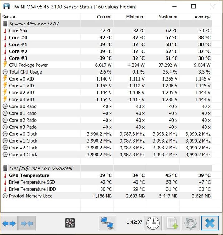 @captn.ko & All: Ist es normal, daß wenn man im BIOS auf das Overclocking einstellt, ab 38x die Lüfter ständig hochdrehende Lüfter auch im IDLE? Zwischenzeitlich dachte ich sogar er taktet die 4GHz nicht herunter, daß hat nen Weilchen gedauert??? Die ersten Minuten nach dem Start hatte er auf allen Kernen konstant 4GHz ohne wirklich Last zu haben. Aktuell zeigt mir OCCT und XTU auch die richtige Frequenz des Prozessors an, was zuvor nicht der Fall war??? Dafür hatte ich gestern bei meinen Test überhaupt keine schwankende Taktung EDIT: Ja ich bin des Räzels auf die schliche gekommen, der Netzstecker war nicht drinnen *duckundwech* aber ein interessantes Phänomen, mit Netzstecker zeigt er mir im OCCT und XTU die falsche Frequenz am CPU an. Nur HWiNFO64 seigt die richtigen Werte. Dafür Taktet er im IDLE am Netzstecker nie herunter? Ist das ein Fehlverhalten? Vllt sollte ich doch erstmal auf das Kabylake BIOS 1.0.8 gehen. Hier ein Screenshot der zeigt, daß in über 90 Minuten IDLE der Takt konstant bei 4 GHz lag. -