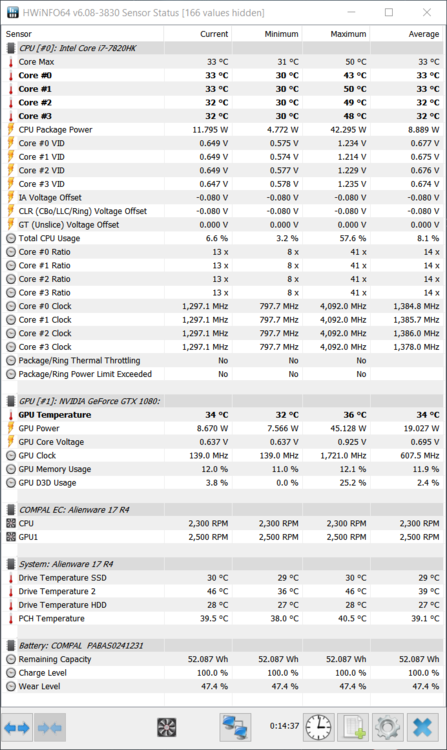 11. @Kenny_0815 Hier mal ein paar Gedanken Egal wie, die Temperaturen sind aktuell unterirdisch, für das was Dein System kann, ein Repaste ist dringend nötig. Aber dadurch fällt Dir / uns auf, daß bei Dir ein Hintergrundprozeß läuft, der auflösungsunabhängig Last produziert! Diesen solltest Du mal finden Es scheint als würde die Last sowohl auf der GPU (12,0W -> 40,7W) als auch auf der CPU steigen Jedoch fehlt uns die CPU Power im Screenshot für einen Vergleich. Ggf. wird die CPU aber auch nur wärmer, da die GPU auf der Heatsink mehr wärme abgibt. Da wir beide die gleiche Hardwarekonfiguration haben kannst Du gerne mal mein HWiNFO64 Setting nutzen, man sieht dann auf einem Blick gleich mehr. Ggf. mußt Du noch die Sensoren für die SSD anpassen, wenn Du nicht die EVO 960 verbaut hast. 20200605_HWiNFO64_settings_Alienware_17_R4.reg Da ich ebenfalls einen externen Monitor nutze (3440x1440) auch ein Vergleich zu den Temperaturen die Möglich sind mit allen Mods aus dem Link oben. Die Temperaturen unterscheiden sich bei mir nicht ob ich den internen oder externen Monitor nutze. Klick auf's Bild zum vergrößern.