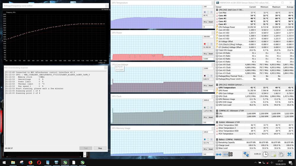 Ich habe den OC Scanning des MSI Afterburner ausprobiert und es funktioniert, sicherlich kann man manuell dort noch etwas nachtunen. Die aktuelle Kurve geht bis ca. 2075 MHz bei 1,093 Volt. Und im Durchschnitt wurden um 193 MHz höher getaktet, dieser Wert bezieht sich auf den bereits ein leicht erhöhten Takt über den GTX 1080 OC Update von Dell, dieses hebt auch das Powerlimit etwas an, so daß sind nun Werte bis 200 Watt möglich sein sollen. Zuvor bin ich nie über 168 Watt gekommen. Hier ein paar Screenshots vom OC Scanner in Arbeit. Man sieht er scannt vier OC Punkte und Taktet leicht hoch bei konstanter Spannung. Dabei wird die Stabilität der Settings gemessen. Dies macht er bis bei jedem Meßpunkt ein flackern des Bildschirms auftritt, also die Setting nicht mehr stabil laufen. Interessanterweise ist der Stromverbrauch beim ersten Meßpunkt hoher als beim darauffolgenden. Hier nochmal die aktuellen Benchmark Werte für Time Spy und Fire Strike. Gar nicht mal so schlecht für ein mittlerweile 2,5 Jahre altes System. -