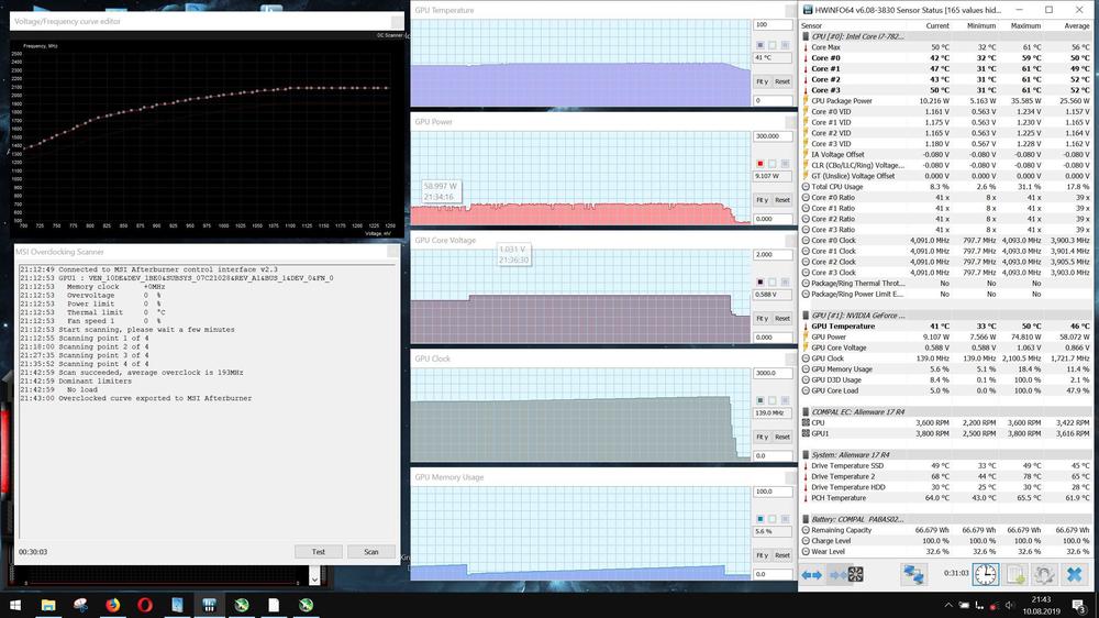 Ich habe hier mal eine Frage aus einem anderen Thread ausgelagert, um die Threads nicht durcheinander zu würfeln. Für die GTX1080 gibt es zwar ein OC Update, jedoch fällt dieses minimal aus. Das Powerlimit wird etwas angehoben. Bei meinen letzten Versuchen vor einem Jahr mit dem MSI Afterburner die GTX 1080 zu undervolten ist die Karte bei jeder Änderung der Kurve abgeschmiert. An einem höheren Takt war nicht zu denken. Siehe mein Post auf der Vorseite: Meine GTX1070 jedoch konnte ich zuvor im Alienware 17R4 sogar über die Kurve um 200MHz höher takten und habe nur bei knapp 2GHz den Takt begrenzt. Frage an alle: Gibt es dort sonst noch mir unbekannte Möglichkeiten die GTX1080 zu übertakten und undervolten? Ich glaube mal gelesen zu haben, daß der Afterburner nun diese Kurve selber optimieren kann? Wer hat das mit einem Alienware 17R4/R5 mit der GTX1080 probiert? -