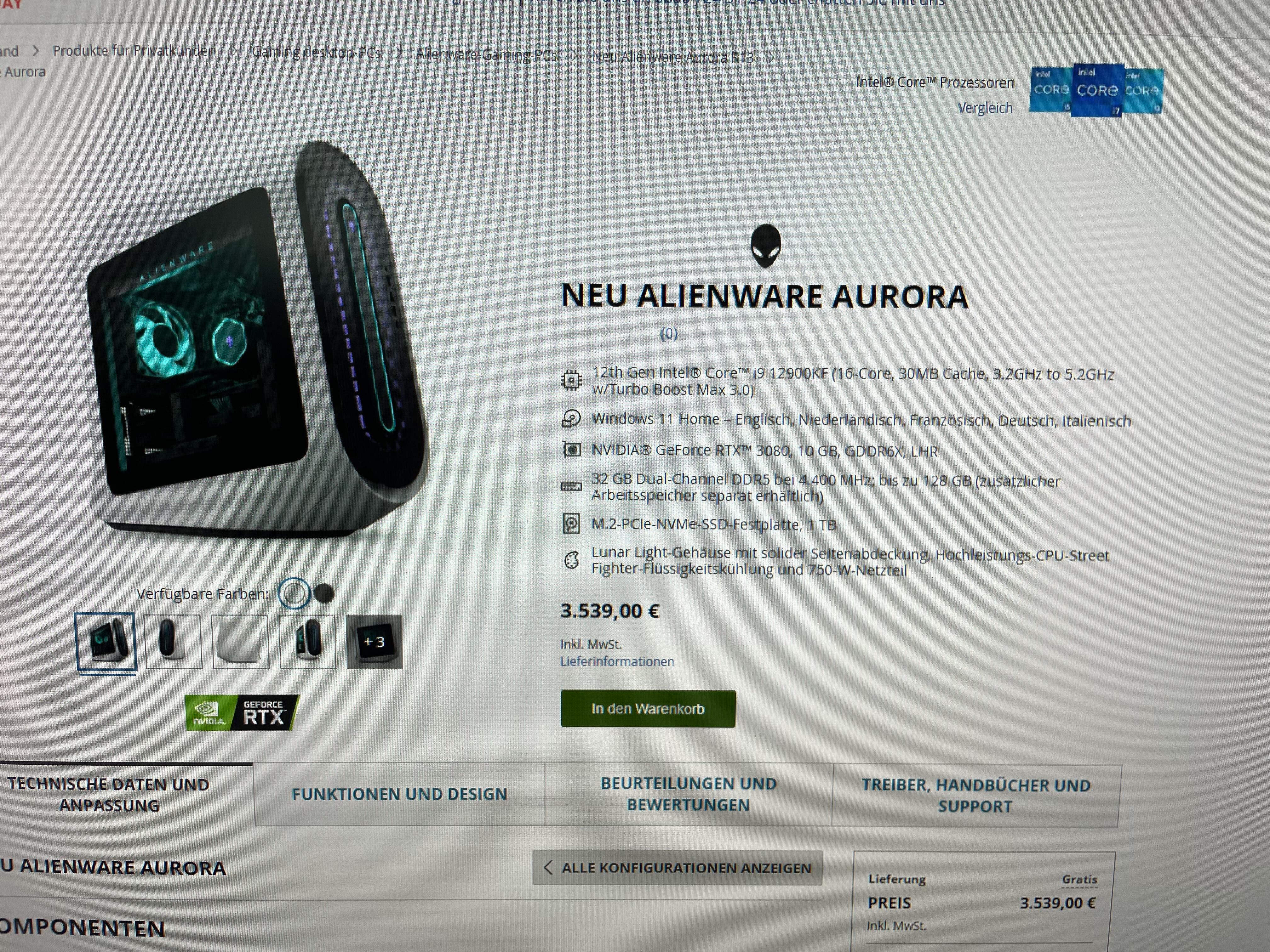 Hallo Aliens, nach langem hin und her verkaufe ich nun meinen Alienware Aurora R13. Der Pc ist nun knapp 1 Jahr alt und im tadellosen Zustand. Ich verkaufe ihn da ich nun ein eigenes System bauen möchte. Wichtig: Der Pc wird ohne SSD, ohne CPU und ohne GPU verkauft!!! Flüssigkeitskühlung (Streetfighter) und die Stock Fans sind alle vorhanden. Bei Interesse einfach anschreiben. Dann gebe ich euch mehr Infos. VG Hier noch ein Bild des Pc‘s. Sowie der damalige Preis (natürlich mit Hardware) Schaut ansonsten einfach mal bei Alienware vorbei dort wird der Pc immer noch so angeboten.