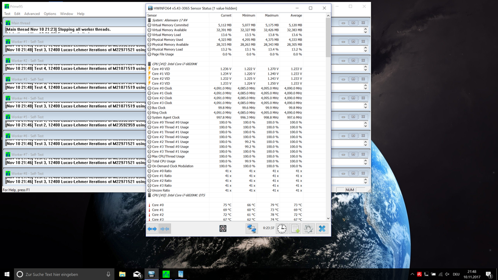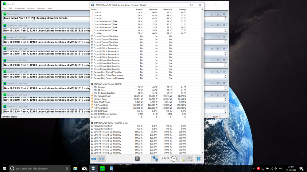 4. Nabend Leute, habe nach meinem Repaste mit Liquid mal übertaktet. Nur verstehe ich da einige Sachen nicht vielleicht könnt ihr ja helfen. Habe im Bios Multi 41x ( ohne extra Turbo Voltage) eingestellt und mit Prime 95 getestet. Ich weis es sind nur knapp 30 Min aber dort lief es bisher stabil. Musste bereits einen Offset von +0,02V setzen ansonsten bekomm ich die 4,1 nicht stabil. Wie Ihr auf den Bildern sehen könnt läuft das Ganze im Schnitt auf 1,233V und 91,8 W wo ich eigentlich dachte das bei 77 W doch Schluss sei. Ist 91 W nicht viel zu hoch??? Auch rennt die CPU ständig ins Powerlimit. Unter Last im Stresstest wird der Takt jedoch gehalten aber sobald ich zocke bleibt der Takt nicht konstant er fällt hin und wieder. Was läuft hier falsch? Gruß Stresstest mit Prime ca. 23 Min In Game, Takt nicht stabil ?