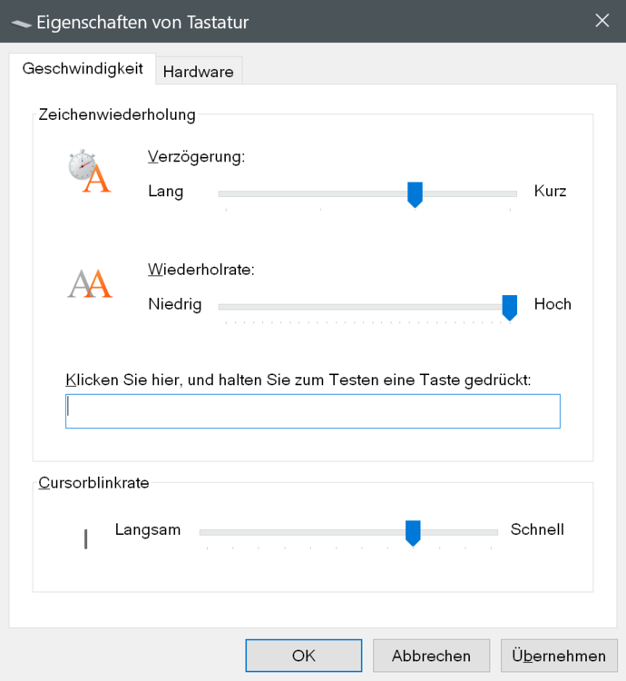 5. Eine Frage. Hat noch jemand komisches Tastatur verhalten nach dem Notebook ein Mal im "Energie sparen" Modus war? War das Notebook ein Mal in "Energie sparen" Modus, dann ist die Zeichen Wiederholrate sehr niedrig. Ich kann z.B. nicht mehr ganz schnell mit Backspace den Text löschen, es geht aber dann verschwindet der Text nur sehr langsam. Geht man auf die "Eigenschaften von Tastatur" und macht die Wiederholrate auf schnell, dann geht alles wie gewohnt. Dieses Verhalten kann ich bei A15 R3 und 13 R3 (2017) reproduzieren. Kann man dagegen was machen?