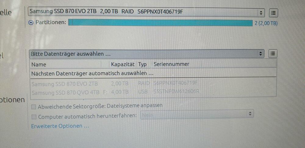 hallo leute brauche eure hilfe ,ich habe seinerzeit meine 1tb festplatte auf eine 2 tb festplatte geklont und dann eingebaut . so da ich aber manchmal viele filme auf einen schlag bekomme wird die 2 tb immer etwas knapp ,bis ich die auf eine ander platte verschoben habe . so also habe ich mir ein 4 tb platte gekauft . und habe die formartiert . sie wird erkannt also alles gut . programm habe ich das hd -clone kostenlos version .jetzt wollte ich die 2tb auf die 4tb clonen beide platten werden erkannt aber die 2 platte bleibt hellgrau und man kann sie nicht anklicken . was mache ich falsch und wo drann kann es liegen ? hab mal foto gemacht .hoffentlich kann mir jemand helfen .