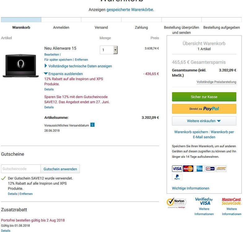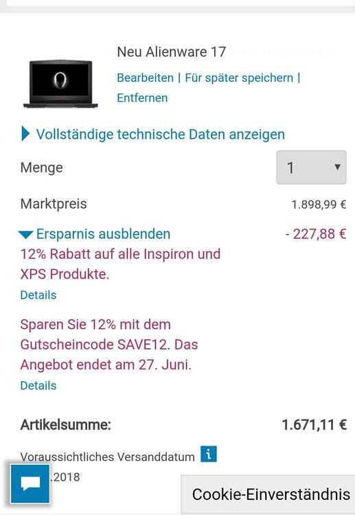 22. Tach Leude, grad zufälligerweise gesehn: aktuell 12% bei Dell/Alienware, auf alle Systeme. Läuft bis 27.06.2018 Code: SAVE12 Mal spaßeshalber nen AW 15 konfiguriert und kam auf knapp 430 € Ersparnis, (ca. 3200 € statt 3640 €). Gruß