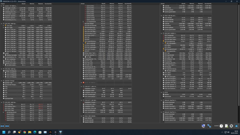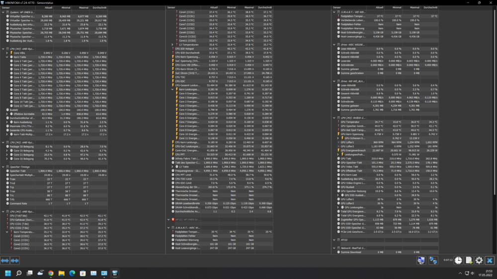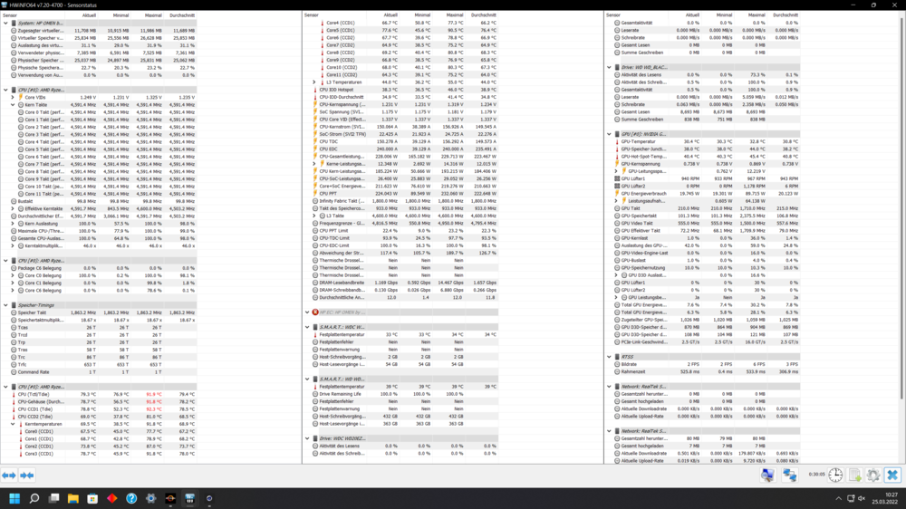 Moin zusammen, Der HP ist angekommen und der erste Eindruck: Ist der groß! Auch im Vergleich zum Aurora ist er eine ganze Ecke höher. Der Ersteindruck zur Performance: Schlecht. Bei der Einrichtung lief das Gerät sehr träge brauchte Sekunden um die Win Einstellungen zu öffnen. Nach ein paar Updates, fällt das zumindest nicht mehr auf. Allerdings ist in meinem System der Wurm drin bzw. die "Optionen" zur Performance-Einstellungen sind quasi nicht vorhanden. Im BIOS kann man gar nichts, wirklich gar nichts einstellen. Bei Alienware konnte man zumindest Ram Speed und AMDs Precision Boost in zwei Stufen bzw. Automatischer Verwaltung einstellen. Ähnlich dem AWCC gibt es bei HP ein Gaming Hub. Allerdings ist die Funktionalität hier sehr überschaubar. Man kann den RAM Speed von 3200 auf 3700 Mhz erhöhen, Lüfter bzw. Energieprofil auswählen und Beleuchtung einstellen. Warum kann man zumindest das nicht im BIOS einstellen? Unter dem Reiter der Lüfter gibt es zwei Performance Modi: Ausgeglichen und eben Performance. Im Performance Modus soll AMDs Precision Boost aktiviert werden bzw. laufen die Lüfter dann immer im Lüfterprofil Turbo. Zwei andere Lüfterprofile Still und Normal sind im Performance Modus nicht auswählbar. Zur Lüftercharakteristik komme ich gleich. Wenn nicht der Performance Modus an ist, genehmigt sich die CPU allerdings max 105 Watt, egal welches Lüfterprofil ausgewählt. Mehr als 105 Watt sind also nur im Performance Modus mit den Lüftern auf Turbo möglich. Allerdings lässt sich das ganz einfach umgehen, wenn man den Ryzen Master verwendet. So habe ich im Performance Modus Ausgeglichen und Lüfterprofil Still ein manuelles OC von 4.6 GHz erstellt und die CPU genehmigt sich sodann auch mehr als 200 Watt. Das System ist, so kann ich das jetzt im Ersteindruck berichten, durchaus Stark in der Kühlleistung. Anbei ein 30 Min CB23 Run mit dem erwähnten Profil Ausgeglichen/Still. Womit ich auch direkt die Lüfter ansprechen möchte. Das System wird nicht übermäßig laut vlt. 40 db ( habe ehrlich gesagt vergessen, zumindest mit dem Handy zu messen ) beim Zocken. Für mich ist die Lautstärke zwischen Zocken und Idle sogar gleich gewesen was für mich ein weiteres Problem darstellt: Die verdammten Lüfter bzw. die AIO geht nicht komplett aus bzw. nur dann wenn ich die Tastatur nicht berühre. Die Lüfter vom Aurora mit den Noctuas waren da um längen angenehmer. Aber nicht das ich falsch verstanden werde: Der Omen mutiert nicht zum Brüllaffen, er ist beim Zocken sogar ziemlich leise, so leise, dass er auch im Idle die Geräuschkulisse beibehält. Habe allerdings mal die Lüfter auf Max gestellt und dachte die ganze Bude hebt gleich ab. Eine F16 dürfte beim Start nicht viel lauter sein. Die Temperaturen sind also in Verbindung mit der Lautstärke ok, wenn doch nur kompletter Stillstand herrschen würde, mit dem Programm Fan Control konnte ich die Lüfter nicht ansteuern. Die Performance zumindest beim kurzen antesten mit Bf5 ist allerdings nicht optimal. Die GPU Auslastung schwankt sehr stark, irgendwo gibt es irgendwie ein Bottleneck. Normalerweise müsste die GPU mit der Kombination immer mit 99% ausgelastet sein oder vielleicht mal auf 90% dippen. Hier fällt das ganze auch mal auf 70% bzw. die FPS von 190 auf 130. Ich habe ums verrecken nicht finden können woran das jetzt lag. Ich bin erst in ein paar Tagen wieder Zuhause und werde es wahrscheinlich mit einer Neuinstallation evt. sogar Clean Install von Windows versuchen. Wenn ich das nicht gefixt bekomme muss das Gerät zurück. Mit den Lüftern käme ich irgendwie klar, aber nicht wenns mit der Kombination Ruckelt.