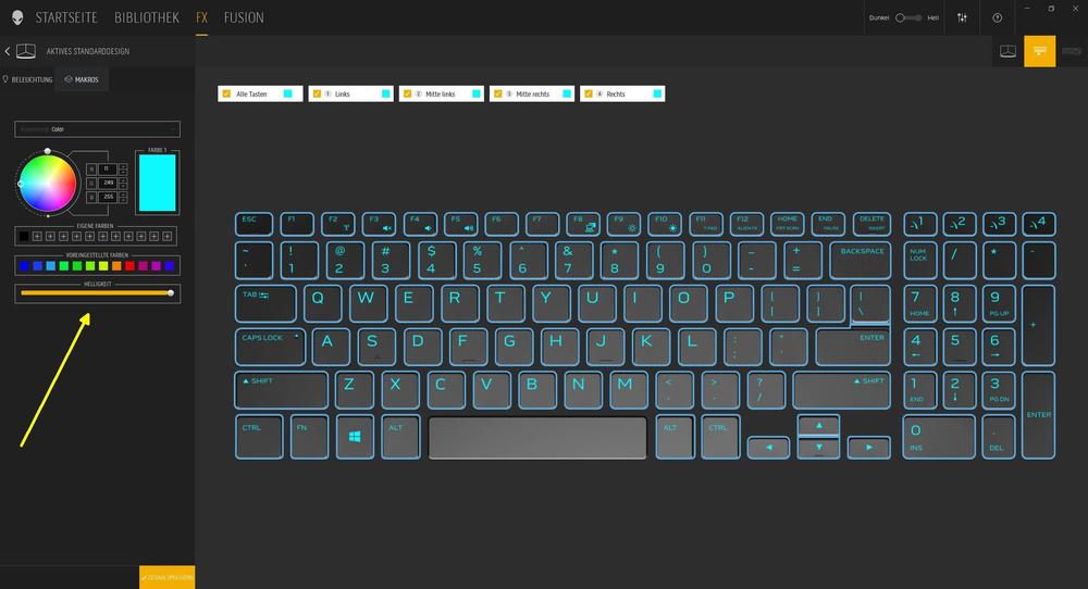 20. Bei mir geht das problemlos. Im AWCC unter FX ist ein Regler womit du die Helligkeit steuern kannst.