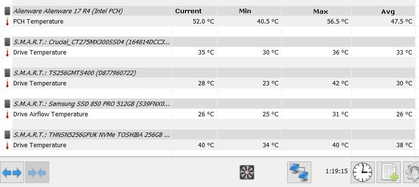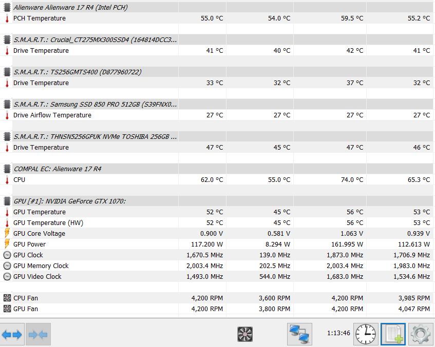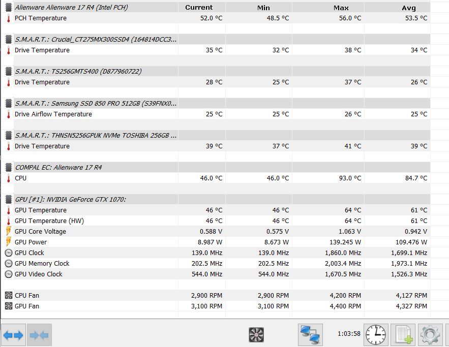 @CMMAP @captn.ko als erstes zu den Werten, ich messe noch mal ohne Idle-Lauf. Ich hatte das meist so gemacht, dass ich ca. 15-20 Minuten gespielt habe und erst dann HWinfo starte, so hat man nur den Load-Wert drin. Ich versuche das dann gleich mit zu loggen. Brauchst du nur die CSV Datei? Dann zu dem Spiel und den Temps, wenn ich mir meine Werte vorher angucke, dann bin ich schon zufrieden, ebenso auch im Vergleich mit anderen User die ihre Temps gepostet haben, nicht unbedingt hier im Forum, aber halt mit dem was ich bisher gesehen habe. Und das die CPU endlich einheitliche Kerntemperaturen hat ist ebenfalls für mich ein kleiner Erfolg. Wie gesagt, ich hoffe, dass das erstmal auch so bleibt. Um besser zu verstehen warum ich zufrieden bin, hier noch mal ein altes Bild mit dem aktuellen 1080 HS ohne SSD-Kühler Mod. Deine Kritik ist vollkommen berechtigt und natürlich nehme ich dir das nicht übel. An dieser Stelle schon mal Dankeschön für den netten Hinweis. Es ist immer wichtig einen freundlichen Ton im Forum zu wahren. Ich möchte hier keinesfalls irgendwas schönigen oder falsche Werte vermitteln, deswegen nehme ich auch deine Kritik an und teste mit Log usw. Vielleicht stellt sich ja wirklich heraus, dass der Mod gar nicht so toll ist bzw nicht viel bringt. Ich will's ja schließlich auch wissen und gucken was geht, die anderen die es interessiert wahrscheinlich auch. Was ich noch beifügen muss, das System läuft ganz normal ohne Undervolting oder Overclocking, ganz normal out of the box. Damit wollte ich mich dann in naher Zukunft auseinander setzen wenn ich weiß was kühltechnisch erstmal geht. Dann habe ich auch einen besseren Vorher-Nacher Vergleich. Nun zum LM, ehrlich gesagt bin ich (wieder) am überlegen LM vielleicht doch einzusetzen (dank dir). Ich hatte mir schon damals mal überlegt wie ich es "verlaufssicher" bekomme. Also so, dass ich damit ruhigen Gewissens leben kann. Ich habe nicht unbedingt Schiss das es auf das Motherboard läuft, sondern eher auf die Alublöcke der CPU und GPU und mir schön das Alu wegfrisst. Ich hatte mir damals Methoden überlegt wie man das ganze konservieren/ schützen kann. Ich gehe da jetzt nicht zu sehr in Detail, da es nicht wirklich hier reinpasst. Ich probiere es erstmal beim meinem R2 aus. Der braucht definitiv eine bessere Kühlung. Was hast du für LM genommen? TG Conductonaut? Zurück zum Mod, auch wenn ich nicht so der Freund von irgendwelchen Notebook-Ständern bin, vermute ich das der Mod in Verbindung mit einer aktiven Kühlung durchaus gute Leistungen erzielen könnte. Vielleicht probiere ich das mal aus. -