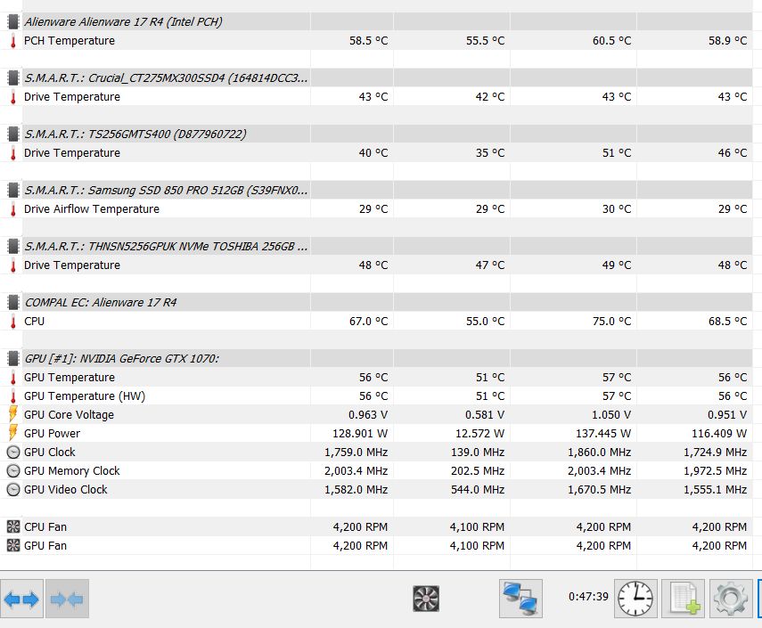 Es gibt neue Testergebnisse. Hier das Ergebnis kurz und bündig zusammengefasst: Ich habe den Notebook-Kühler und die Gummi-Füße hintereinander eine Stunde lang mit FarCry 5 getestet. Gut, auf den ersten Blick ist der Unterschied jetzt nicht so gewaltig. Wie bereits gesagt, ist der deutlichste Unterschied im Bereich der Tastatur zu spüren. Während bei allen Erhöhungen der Bereich um und auf der Tastatur sehr warm wurde, ist es bei dem Notebook-Kühler vielleicht gerade mal handwarm. Zudem ist kühlt das Notebook deutlich leiser, da die Lüfter nicht auf 4.200 rpm permanent laufen. Interessant wäre vielleicht noch ein Test ohne Backplate, so das die Lüfter ohne Widerstand auf den Heatsink pusten. Da ich noch recht viele HWinfo Bilder habe, werde ich noch eine kleine Zusammenstellung machen, wo man jede Verbesserung der einzelnen Mods sehen kann. Angefangen mit dem Wechsel von Wärmeleitpaste, über Tausch des 1070 auf den 1080 Heatsink, dann den Heatsink-Mod mit den SSD-Kühlern, anschließend die Erhöhung und dem Notebook-Kühler mit aktiver Belüftung und zu guter Letzt die Temps mit LM. -