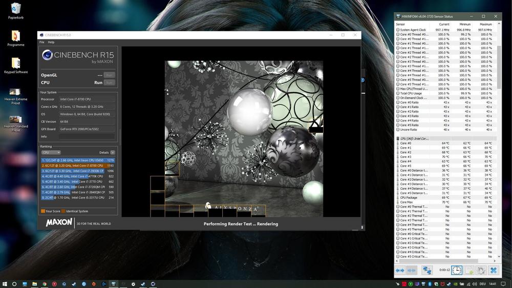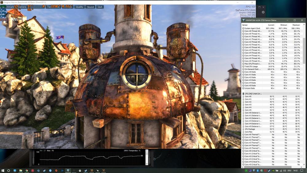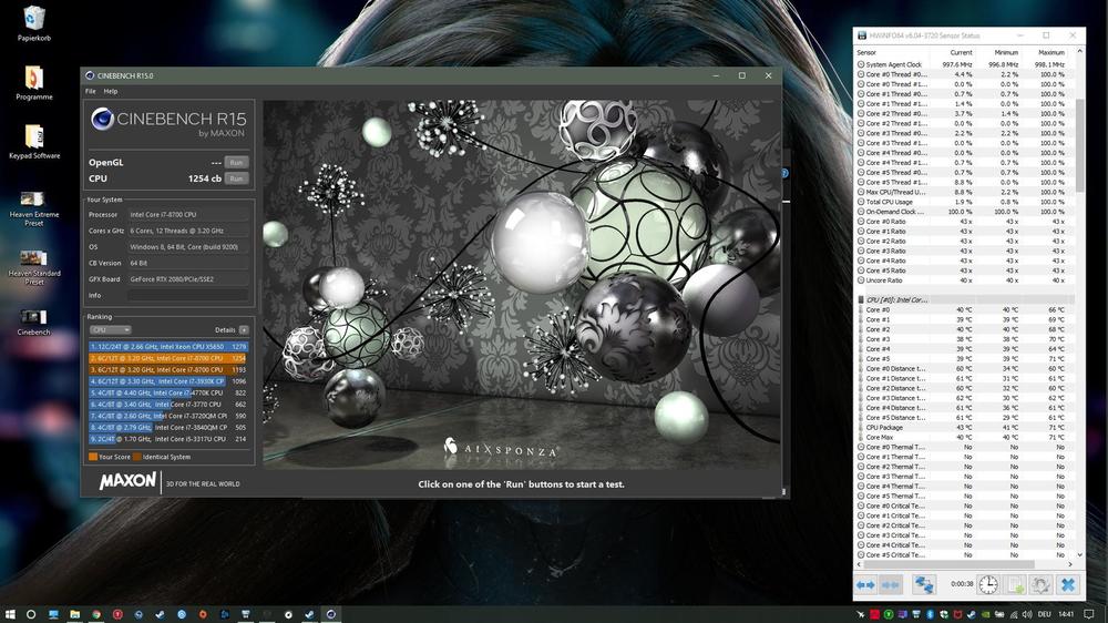 Hallo zusammen, jetzt auch mal von mir ein paar Benchmarkergebnisse. Wenn ihr was bestimmtes sehen wollt oder Verbesserungsvorschläge habt, immer her damit. Bin nicht wirklich der Profi in sowas, ich zocke lieber Ich bin mit meinen Temperaturen sehr zufrieden. Normalerweise lasse ich wegen der Lautstärke das Lüfterprofil "Ausgeglichen" immer aktiv, habe für den Test aber "Leistung" gewählt. Meine Konfiguration: Intel i7 8700 -> Mittels Throttlestop CPU Core und Cache 125 mV undervolt 16GB Ram RTX2080 mittels Afterburner bekommt die Graka maximal 0.912 mV bei maximal 1920 MHz. Das sind nicht die finalen Werte, hatte nur keine Zeit mich da noch näher an das Mögliche heranzutasten. Heaven Standard Preset: Cinebench Temps: Cinebench Ergebnis: Ein Upgrade auf den 9900k ist erstmal etwas in den Hintergrund gerückt, da ich im jetzigen Zustand äußerst zufrieden bin mit meinem Area 51m. Der frisst einfach alles, was ich Ihm vor die Nase werfe, anstandslos. -
