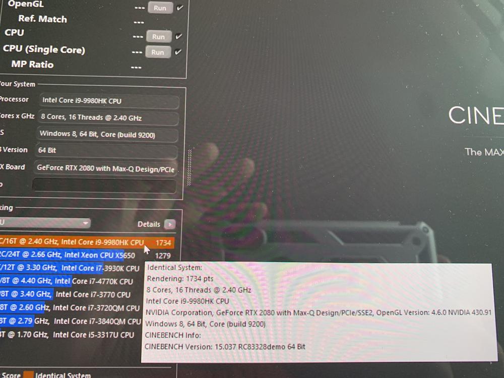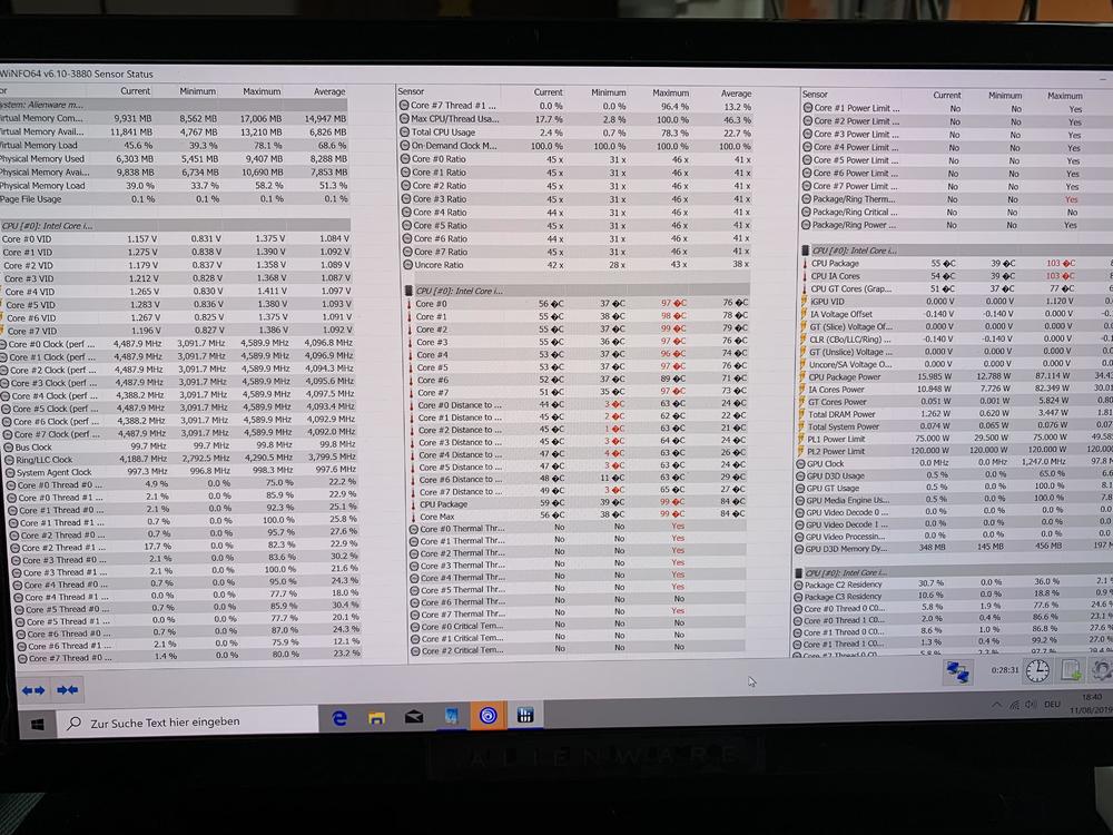 Also mein i9 9980 mit 2080 Max q läuft im Durchschnitt bei den Spielen mit 4,2-4,3 ghz bei ca 80 Grad bei -0,120 undervolt. Ohne groß Belastung,also surfen usw 50-60 Grad bei 4,6ghz. Gpu habe ich noch nicht übertaktet da bislang alles sehr gut läuft. Spiele zurzeit wieder Dark Souls 3 in 4K mit Max Details ohne Probleme. Bislang läuft das System rund und wie schon geschrieben ist das Display fantastisch!! Würde ihn so wieder kaufen. Ob i9 9980 oder i7 wäre eine Überlegung da der Aufpreis recht hoch ist. Wollte aber das Maximum haben und wer weiß dann werden doch wann 8kerne benötigt... Upgrade geht ja nicht.Bislang nichts bereut und sollte die nächsten Jahre gute Dienste leisten. Optik find ich im slim Design auch toll.Hätte mich beim 51m aber auch nicht gestört. -