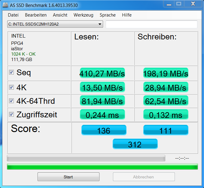2. dann hier auch mal mein Benchmark. System/Plattenalter: 1 Tag System: M17xR3 SSD Typ: Intel 510 120GB Firmware: ? Treiber: Intel Füllstand (durchschnittlich): bis jetzt ca. 20%, weil erst seit Heute und neu.