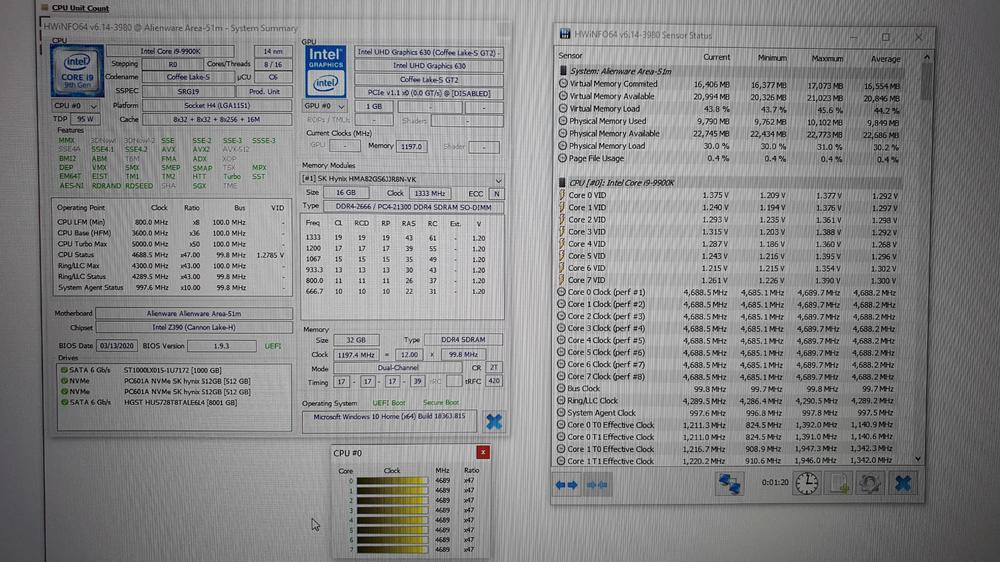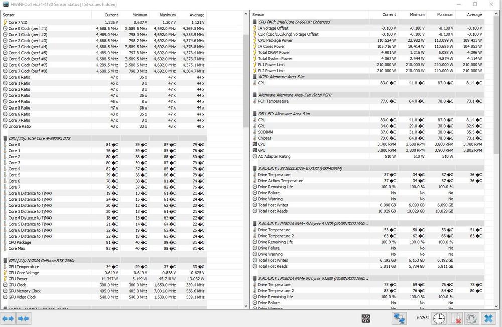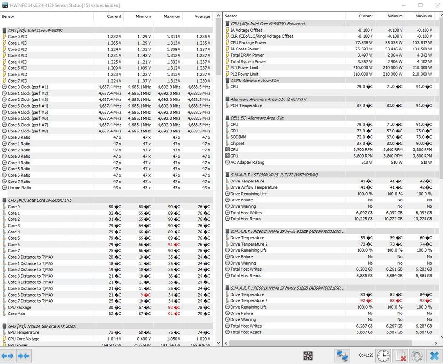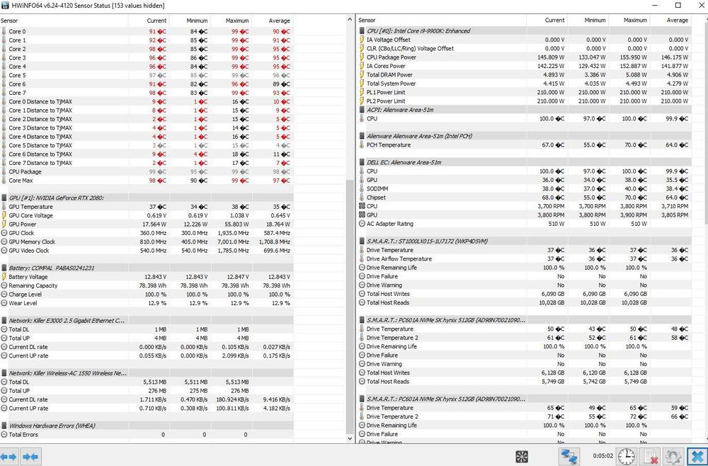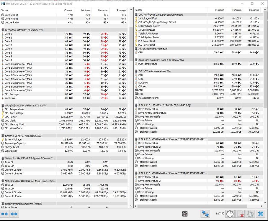 Alienware Area-51m R1 Temperaturen CPU und GrafikkarteMiniMarcel antwortete auf MiniMarcel's Thema in Allgemeines & Troubleshooting Hallo, also wollte mal eine objektive Bewertung von Euch haben ob das so in Ordnung ist... Ich habe jetzt nochmal mit dem Intel Extreme Tuning Utility Tool um -100mV undervolted. Nach mehreren Test mit Cinebench, 3DMark (auch mit Belastungstest über "97%") läuft das System bis jetzt ohne Bluescreen. Die Temps im Anhang sind mit Volle Geschwindigkeit ohne externen Lüfter an. Ebenso sind die Temperaturen einmal nach circa 45 Min - 1 h Fortnite und die anderen mit COD auf "Vollen Einstellungen" nach 1:15 Stunden. Ist es normal das Drive Temperature 2 (ist wohl eine der M2´s ?) eine so hohe Temperatur hat ? Oder ist das eher "normal"? Würdet ihr das Setup so lassen mit den Werten oder eher etwas verändern und wenn was genau ? GPU ist bei COD bei ca. 70- 75 °C, denke das ist ok... Sind viele Fragen ich weiß... Ich hoffe ich belästige Euch damit nicht ... Wünsche Euch einen guten Start in die neue Woche ! Liebe Grüße, MiniMarcel