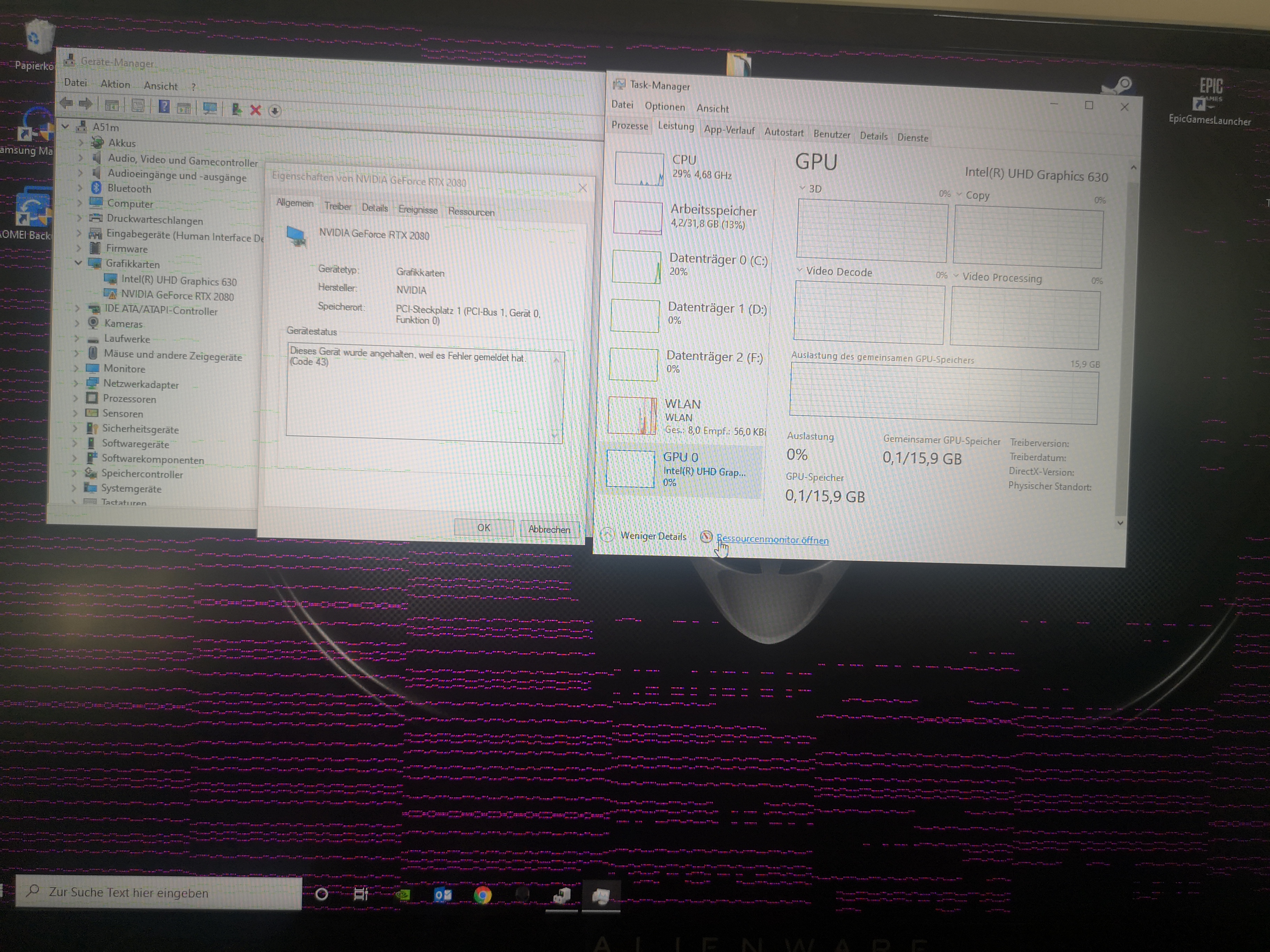 Ich Reihe mich hier mal mit ein. Gestern beim Eso spielen (50% Auslastung / <60°C) hat sich meine RTX 2080 (so halb?! ) verabschiedet. Sie wird zwar im Gerätemanager erkannt, aber taugt halt nix... S. Bilder Es sollte erwähnt sein, dass hier stets alles aktuell gehalten wurde & auch nie im OC Betrieb war ... Das VBios war schon ab Werk bei 180w & nie höher als das von Dell Upgedatete Templimit 74/75°C überschritten. Nach 4 Monaten Erhalt war die Soundkarte/Mainboard defekt (August '20) & jetzt (nach weiteren 4 Monaten) die GPU Nicht das, was man sich beim einem Alienware erhofft... Tech support kontaktiert, die übliche einstündige Telefon-"Therapiesitzung" vollzogen & ja, sofern verfügbar, erfolgt ein zügiger Austausch. Äußerst doofer Zeitpunkt wieder mal xD Wünsche euch allen einen guten Rutsch & ein besseres Jahr 2021. Gruß Mylo