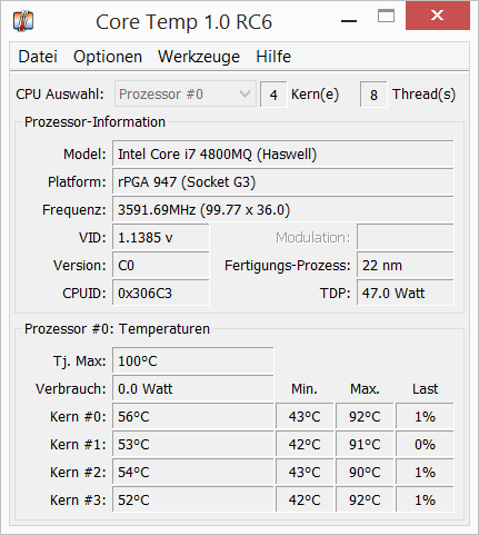 Hallo zusammen, habe seit 1 Woche ein neues Alienware 14 mit Intel i7 4900MQ und der NVidia 765M. Bei Multimedia Bearbeitung oder dem Stress Test des Intel Extreme Tuning Utility schaltet sich das Gerät binnen Sekunden aus. Aber im Normalfall läuft die CPU gerne mal kurz bei 3,4-3,5 GHz ohne dass ein Lüfter startet und ohne dass das Notebook sich abschalten würde. Sehr merkwürdig. Ist der Turbo Boost via BIOS Option vollständig deaktiviert, gibt es keinerlei Probleme. Die Maschine läuft dann unter Volllast ohne Probleme auf 2,8GHz. Kann jemand dieses Problem bestätigen? Bevor ich den Support kontaktiere, würde mich Euer Feedback interessieren. Aktuellste Treiber und BIOS sind installiert. Danke Euch schon mal für jegliches Feedback. UPDATE: Betriebssystem wäre wahrscheinlich noch von Interesse...Windows 8.1 Pro 64-Bit.
