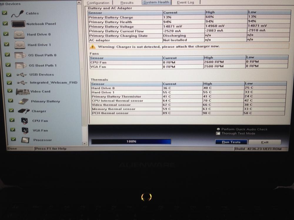 hallo Leute, habe mir ein Alienware 15 R1 gekauft und den ePSA Diagnostic- Test im Boot Menü gestartet. Der Test wird ohne Fehler bestanden jedoch hätte ich Fragen was bei euch so für Temperaturen rauskommen. Die 89°C des PCH Sensors gehen nie runter - der CPU Lüfter schaltet sich bei mir mit BIOS A06 bei 70°C ein, jedoch fällt die PCH Temperatur maximal um 1-2 Grad. Das bedeutet das das Gerät im Idle eigentlich ununterbrochen 89° hat, was mir doch etwas hoch vorkommt... Wie sieht das bei euch und generell die Temperaturen aus? Danke für eure Hilfe!