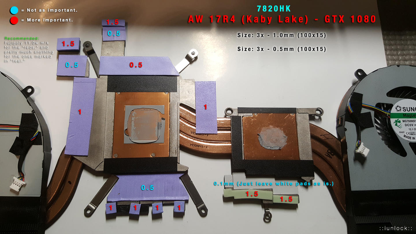 Hi Zusammen, da mein AW17R4 Repaste Guide gut angekommen ist und ich gestern den LM Repaste bei meinem R5 gemacht habe, ist es an der Zeit den Guide mit einem Update zu versehen. Der AW17R5 ist genau wie der AW17R4 aufgebaut. Nur die Pads haben unterschiedliche Dicken. Der Übersicht halber erstelle ich trotzdem einen neuen Thread und übernehme die Schritte die gleich sind aus dem alten Thread. Wie immer: wers nachmacht bitte Feedback hier im Thread da lassen bitte paar Ergebnisse posten. ##### An dieser Stelle ein großes Danke an iunlock für seine Mühe und harte Arbeit! Ich darf hier seine Bilder verlinken und ergänze den Guide mit meinen persönlichen Erfahrungen. Original "Guide by - ::iunlock:: with Team LiquidHz" http://forum.notebookreview.com/threads/alienware-17r4-15r3-disassembly-repaste-guide-results.797373/ ##### ######Vorarbeiten####### Zuerst solltet ihr euch fragen ob ihr mit Liquid Metal (LM) oder normaler Wärmeleitpaste (WLP) arbeiten wollt. Der Vorteil von LM liegt auf der Hand. Die Wärmeleitfähigkeit ist einfach genial. Der Nachteil ist aber ebenso gravierend. LM ist nämlich elektrisch leitend. Wenn daher etwas daneben läuft und einen Kurzschluss verursacht produziert ihr einen teuren Briefbeschwerer. Wenn ihr aber dem Guide ordentlich und gewissenhaft folgt ist das Risiko durchaus tragbar. Ich habe aktuell seit 20 Monaten ein AW17R1 mit LM im Einsatz und bisher keine Probleme feststellen können. Zu Besorgen sind also: 1. Wärmeleitmittel 1.1 Liquid Metal: Ich empfehle Thermal Grizzly Conductonaut. Coolaboratory Liquid Ultra geht auch. Die Temperaturen bei Conductonaut sind 2-4 Grad besser bei mir. https://www.caseking.de/thermal-grizzly-conductonaut-fluessigmetall-waermeleitpaste-1-gramm-zuwa-153.html ODER 1.2 Normale WLP. Da geht aktuell nichts über die Thermal Grizzly Kryonaut. https://www.caseking.de/thermal-grizzly-kryonaut-waermeleitpaste-5-55-gramm-1-5-ml-zuwa-126.html 2. Glasreiniger 3. Zewa Küchenrolle 4. Die Passenden Wärmeleitpads. dieses mal hab ich die Pads von Arctic genommen, da sie etwas weicher sind als die von TG. Ihr braucht: 1x Arctic Thermal Pad 1 mm 145 mm x 145 mm 1x Arctic Thermal Pad 0,5 mm 14 5mm x 145 mm 1x Arctic Thermal Pad 1,5 mm 50 mm x 50 mm https://www.amazon.de/ARCTIC-Thermal-Pad-Wärmeleitung-Installation/dp/B00UYTTXSM/ref=sr_1_4?ie=UTF8&qid=1528227304&sr=8-4&keywords=arctic+thermal+pad 145mm x 145mm ist natürlich viel zu viel, aber die kleineren Versionen müsstet ihr mehrmals kaufen so das der Preis ähnlich wäre. So bezahlt ihr das selbe, könnt aber mehrfach repasten 5. Passendes Werkzeug. Die meisten Fehler und Beschädigungen passieren durch falsches oder improvisiertes Werkzeug. Spart nicht am falschen Ende ich hab mir das besorgt: https://www.amazon.de/dp/B01ICZI51A/ref=sr_ph?ie=UTF8&qid=1482949630&sr=1&keywords=laptop+werkzeug da ist alles drin was ihr braucht 6. Optional: m.2 SSD Kühler meine pcie SSD wurde über 100 Grad warm. Daher entschied ich mich bei dem repaste die SSD gleich mit einem Kühler zu versehen. https://www.amazon.de/Kühlkörper-Cooling-Strahlung-Austreten-Aluminium-Schwarz/dp/B078M9LZBT/ref=sr_1_7?ie=UTF8&qid=1528272905&sr=8-7&keywords=m.2+ssd+heatsink Hier bitte die oben gekauften 0,5mm Pads benutzen. Das beiliegende 1.5mm ist zu dick um nachher den Deckel drauf zu bekommen. ######Repaste###### Jetzt muss das Gerät geöffnet werden und das Mainboard freigelegt werden. Vorweg: Achtet unbedingt darauf euch zu erden. Also entweder eine passende Unterlage mit Handgelenk Kontakt oder wenigtens mal ne Heizung anzufassen. Schritt 1 Ihr entfernt die 6 Schrauben links und rechts. Die obere Mittlere muss nur gelockert werden, da sie auf der Rückseite gekontert ist. Schritt 2 ALS ERSTES DIE BATTERIE ABKLEMMEN. BLAUER PFEIL Nun die Schauben vom Montagerahmen alle entfernen. Dazu die Stecker vom Mainboard lösen und die Festplatten sowie M.2 SSDs ausbauen. Vergesst nicht die 2 Schrauben auf der Rückseite von der Lüfterabdeckung. Jetzt die WLAN Karte ausbauen. seid bitte besonders vorsichtig bei den Kontakten der Antennen. Die können leicht brechen. Schritt 3 Das Lüftergitter entfernen. Ich musste da an der rechten Seite ganz schön ziehen um das abzubekommen. Es wird nur durch die Nasen und 2 Schrauben gehalten, die ihr bereits entfernt habt. Schritt 4 Die 2 Schrauben von den LED Leisten Lösen. Schritt 5 die letzten 3 Schrauben lösen Schritt 6 jetzt könnt ihr den Rahmen mit so einem Plastiktool lösen. Das ist in dem Set enthalten was ich euch verlinkt habe Damit geht das wirklich einfach. Schritt 7 Die markierten Schrauben lösen. Die Schrauben von den Kühlern bleiben noch drauf. Löst auch alle Stecker vom Board. Hier sind im englischen Guide nicht alle markiert. Einer ist noch unter dem rechten Lüfter, sowie die Stecker am unteren Rand (wenn sie noch nicht gelöst sind) Schritt 8 die restlichen Stecker lösen. Die befinden sich an der Oberkante. ich hab ne Weile suchen müssen weil in dem englischen Guide nicht steht wo die sein sollen ^^ Jetzt solltet ihr das Mainboard rausnehmen können um die Lüfterstecker auf der Rückseite abziehen zu können. Schritt 9 Jetzt entfernt ihr die alten Pads und bringt die neuen wie im Bild an. Achtet auch darauf das ihr ALLE Pads entfernt die eventuell noch auf dem Mainboard kleben geblieben sind! Auf dem Bild steht zwar Kaby Lake aber die Pads sind die gleichen wie bei meinem R5 mit i9 8950HK und GTX1080. Die grünen pads könnt ihr drauf lassen. Die sind super weich und daher ideal an der Stelle. Schritt 10 Falls ihr LM nehmt, beklebt jetzt das Board wie im Bild mit ISO Tape um die Kontakte vor dem LM zu schützen falls ein Tropfen rausgedrückt wird. Streicht jetzt eure Paste der Wahl drauf. Bei normaler WLP jeweils eine kleine Erbse in die Mitte und dann den Kühler montieren. Die Paste wird dadurch Blasenfrei verteilt. Macht das NICHT mit LM. LM muss verstrichen werden das es am Ende aussieht wie im Bild Streicht nun etwas LM auf dem Kühler selbs