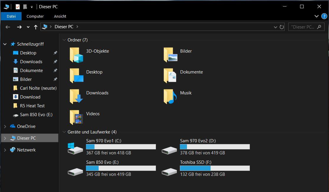 Ich habe wieder ein wenig gebastelt und wollte es euch nicht vorenthalten. Diesmal betrifft es die m.2 SSDs. Lange Zeit habe ich mich gefragt, wieso der R4/ R5 nur zwei PCIe Steckplätze, im Formfaktor m.2 2280 hat (und ein Steckplatz in 2242). Der R2 hat von den 2280ern ganze vier Steckplätze. Um das Upgrade auf eine dritten 2280er Steckplatz fertig zu machen, musste dementsprechend gebastelt werden. Da für die große Testreihe (WLP vs. LM vs. Mod, noch in Arbeit), ich das Case eh zerlegen musste, bot sich die Idee für den Mod an. Beim Repaste legte ich eine 2280er SSD auf Rahmen, um zu überprüfen ob ich für das Vorhaben überhaupt genug Platz finde. SSD grob daneben gelegt und geguckt... joa knapp, könnte aber passen. Als nächstes ging's mit Säge und Messer an den Rahmen. Man muss für den Mod nur wenige Millimeter Plastik entfernen. Im eingebauten Zustand von oben, kann man keine Veränderung erkennen. Und schon kann die PCIe SSD rein. Zwar etwas fummelilg, aber passen und funktionieren tut's schon. Um ehrlich zu sein, hab mich selber gewundert, dass es passt. Hier mal einige Bilder davon: Im BIOS sieht man, dass die SSD völlig normal erkannt wird. Vorher: Nachher: Obwohl ich alle PCIe SSDs eingebaut habe, wird nur eine im BIOS gelesen. Ich vermute, dass es was mit der AHCI (für NVMe Protokoll) Einstellung im BIOS zu tun hat. Vorher hatte ich es auf RAID. Da wurden, glaube ich, auch alle angeschlossenen SSDs erkannt. Wenn jemanden den genauen Grund weiß, kann er mich gerne aufklären. Wie dem auch sei, im Windows wird alles wunderbar erkannt und funktioniert. Der Nicht zugeordnete Speicherplatz kommt durch Samsungs "Over Provisioning" zustande. Ich hatte anfangs die Befürchtung, dass es vielleicht mit dem Strom Probleme geben könnte. Sowohl 2280er als auch 2242 SSDs laufen auf 3.3V, aber der größere Formfaktor braucht mehr Amps. Die kleine 2242er zieht maximal 1,5A auf 3.3V und die 2280er maximal 2,5A, die Samsung Evo plus sogar 2,7A bei 3.3V. Deswegen habe ich mich anfangs nicht getraut es auszuprobieren. Bei 'nem R5 kann das "ausprobieren" recht schnell teuer werden. ? Also musste ich mich ein wenig einlesen und informieren. Kurz um, Erstens gibt es, glaube ich, keine PCIe SSD im Formfaktor 2242. Die 2242 SSD sind in der Regel immer SATA III SSDs. Zweitens, im BIOS ist dieser Steckplatz ganz klar als PCIe-Steckplatz ausgeschrieben. Drittens, werden die PCIe Steckplätze stromtechnisch nicht so klein (1,5 - 2,7A) bemessen, die haben deutlich mehr Luft nach oben. Mit diesen und noch ein paar weiteren Infos war ich mir sehr sicher, dass es ohne Probleme funktionieren sollte. Und wie man sieht, tut es das auch^^ -