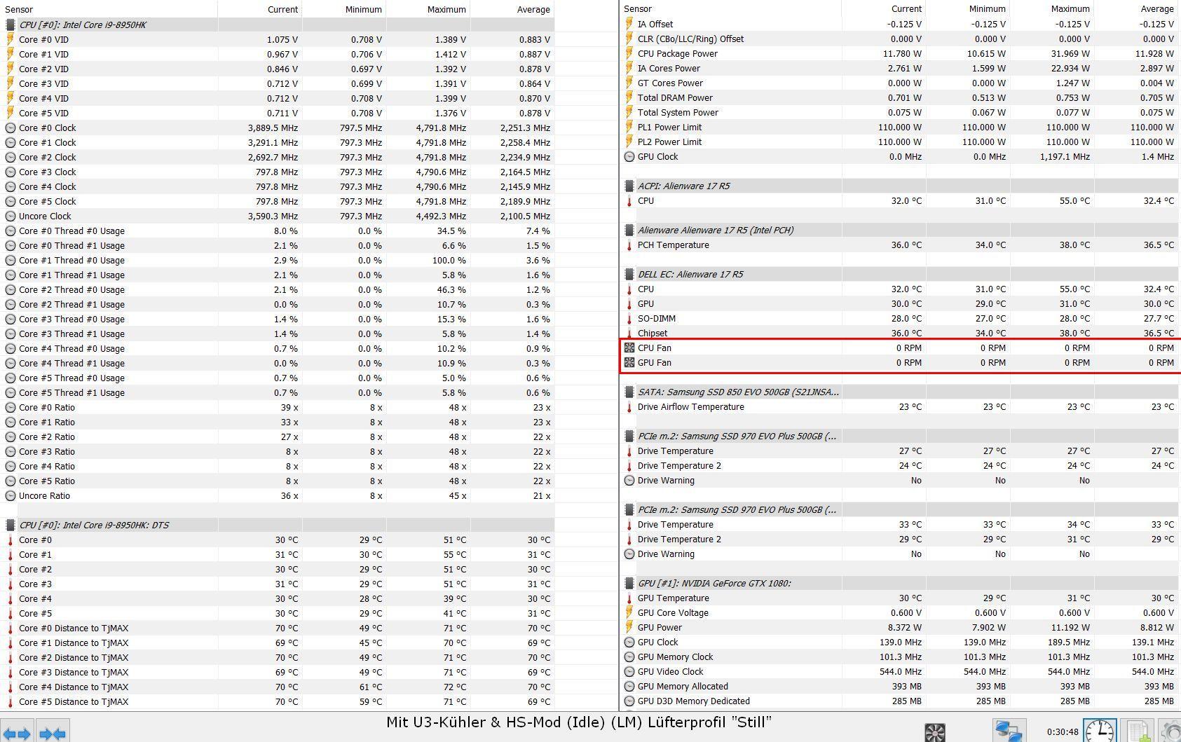 Wie sicher einige mitbekommen haben, habe ich mir den AW17 R5 vom Capt.Ko zugelegt. An dieser Stelle noch mal Danke für die Abwicklung, Geduld, Versand, Chat usw. Hat alles TipTop geklappt ? Da es klar war, dass ich auch dieses Notebook mit LM und den ganzen Mods ausstatten werde, habe ich mir gedacht, dass ich diesmal alles sauber dokumentiere, um zu vergleichen, welche Veränderung, wie viel am Ende tatsächlich bringt. In Absprache mit Capt.Ko, habe ich Prime95 und Unigine Heaven als Basis genommen, mit dem ich die ganzen Tests durchgeführt habe. Alle Stresstests wurden immer unter den gleichen Bedingungen durchgeführt, dazu aber gleich im Detail mehr. Wie ihr euch sicherlich vorstellen könnt, waren das nicht gerade wenig Tests und der Aufwand nahm recht viel Zeit und Geduld in Anspruch. Testgerät: Alienware 17 R5 CPU: Intel i9-8950HK (PL 110W) GPU: Nvidia GTX 1080 (PL 200W) RAM: 16GB @ 2.400 MHz 2x PCIe m.2 SSD 1x SATA SSD QHD Panel + G-Sync PSU: 330W Benutze Software (+Geräte): ThrottleStop HWinfo Prime95 Unigine Heaven FarCry New Dawn + DB-Messer + Thermo-Laserpistole Getestet mit: Wärmeleitpaste (TG Kryonaut) Liquid Metal (TG Conductonaut) Heatsink-Mod, PCH-Mod, SSD-Mod immer UV -125mV Getestet auf: Flach auf dem Tisch Mit Erhöhung 2,5cm Mit U3-Kühler (gemoddet) Weitere Faktoren: Raumtemperatur 23,5 °C Abstand zur Wand 56 cm Lüfterprofil "Ausgeglichen" Energieoptionen "Standard" Letztes BIOS (1.6.2) Zum Stresstest, wie bereits gesagt, wurde mit Prime95 und Heaven das System belastet (Load). Mit ThrottleStop wurde immer -125mV eingestellt. Die genauen Einstellungen könnt ihr den Bildern entnehmen. HWinfo musste ich etwas aufräumen, da man sonst viel zu viele Werte sieht und das Ganze sehr unübersichtlich macht. Nach dem ich die ganzen Werte ausgeblendet habe, sah die Liste dann wie folgt aus: Der Load-Wert wurde wie folgt getestet: Ca. 15 - 20 Minuten Stresstest (Warmlaufphase) Anschließend HWinfo Reset dann min. 40 Minuten aufgezeichnet während des Stresstests Screenshot Der InGame-Wert mit FC New Dawn wurde genauso ermittelt. Der Idle-Wert war da etwas schwieriger. Obwohl ich alles vorher, wie Windows-Updates, unnötige Drittabieter-Tabs, etc (ab-) geschlossen hatte, konnte der Takt nicht bei allen Idle-Werten exakt gleich gehalten werden. Hier bleibt also ein wenig Spielraum mit der Vergleichbarkeit. Den InGame-Wert habe ich mit rein genommen, damit man zu dem synthetischen Stresstest, auch einen realen Stresstest hat. So kann man auch besser vergleichen, in wie weit der synthetische Stresstest einer echten Belastung entspricht. FarCry New Dawn habe ich immer zusammen mit meinem U3-Kühler getestet. Eben genau so, wie ich zuhause halt zocke. In allen Tests lief der U3-Kühler auf ca. 60 - 70%. Damit man sich besser vorstellen kann, wie es bei mir daheim aussah und wie ich getestet habe, habe ich von den verschiedenen Test-Szenarien einige Fotos gemacht. Flach auf dem Tisch: Mit Erhöhung 2,5cm: Mit gemoddeten U3-Kühler: Die Mods kennen wahrscheinlich viele von euch bereits. Vollständigkeitshalber, hier noch mal paar Bilder wie es aussieht: Kommen wir zur der Auswertung. Unten im Bild steht noch mal genau mit welchen Bedingungen getestet wurde. Ich werde immer die selbe Reihenfolge nehmen: "Flach auf dem Tisch" dann "Mit Erhöhung 2,5cm" und abschließend "Mit U3-Kühler". Erst Idle, dann Load und am Ende InGame. 1.0 Idle-Werte mit Wärmeleitpaste: 1.1 Load-Werte mit Wärmeleitpaste: 2.0 Idle-Werte mit Liquid Metal: 2.1 Load-Werte mit Liquid Metal: 3.0 Idle-Werte mit HS-Mod und LM: Hier habe ich noch ein zusätzlichen Test gemacht, wo das Notebook selber nicht mehr kühlt, sondern nur noch der HS-Mod und der U3-Kühler 3.1 Load-Werte mit HS-Mod und LM: 4.0 InGame-Werte (FarCry New Dawn) mit U3-Kühler: Ja, das sind schon verdammt viele Bilder und Tests. Mich hat's aber auch selber interessiert, was die ganzen Veränderungen für Auswirkungen haben. Was sofort auffällt, mit der CPU laufe ich in jedem Test sofort ins TT. Die CPU taktet so lange hoch bis das thermale Limit erreicht wird und drosselt dann wieder, kühlt ab, erhöht wieder den Takt bis das Limit wieder erreicht wird usw. Deswegen kann mehr hier eher den dauerhaft, gehaltenen Takt als die Temps beachten/ bewerten. Das war bei meinem alten R4 mit dem 7820HK noch ganz anders. Dort kam ich mit den selben Bedingungen (LM + Mods + U3) bei InGame-Werten nicht über 73°C im Durchschnitt. Interessant wäre vielleicht noch ein Test mit dem 8950HK bei dauerhaften 4.2 GHz oder so. Mal gucken was das am Ende ausmacht. Was mir schon mal positiv auffällt ist, dass jede Veränderung grundsätzlich eine Verbesserung war. Wobei man auch dort etwas differenzieren muss. Vergleicht man den Erhöhungstest mit den anderen beiden (Tisch und U3), ist hier das System äußerlich am heißesten. Das zeigen auch die Werte des PCH und Arbeitsspeichers. Im letzten Load-Test mit dem U3-Kühler haben wir hier einen Unterschied von satten 23,7 °C. Da soll mal einer sagen, dass Frischluft nicht viel bringt. Ein ähnliches Ergebnis konnte ich auch mit meiner Laserpistole messen. Die wärmste Stelle auf dem Notebook war oberhalb beim Alienware-Knopf. Mit dem U3-Kühler habe ich hier max. 49,2 °C gemessen, flach auf dem Tisch waren es max. 51,2 °C und mit der Erhöhung max. 52,9 °C. Jetzt könnte man denken, dass der Unterschied nicht so gewaltig ist, aber hier strahlt die Wärme deutlich weiter ins Tastaturfeld/ Palmrest hinein. Sprich, ist es oben heißer, wird auch die gesamte Tastatur/ Palmrest wärmer, so wie der gesamte Rest des Notebooks. Am liebsten hätte ich diese Werte mit einer Wämebildkamera aufgezeichnet, aber die ist mit rund 400+ € nicht gerade günstig. Daher nur die Laserpistole. Naja, immerhin überhaupt ein Wert. Im großen und ganzen mit den Tests und Mods sehr zufrieden. Jede Veränderung hat sich positiv auf die Kühlung und somit auf die Leistung ausgewirkt. Vergleich man den ersten Load-Test (Flach auf 