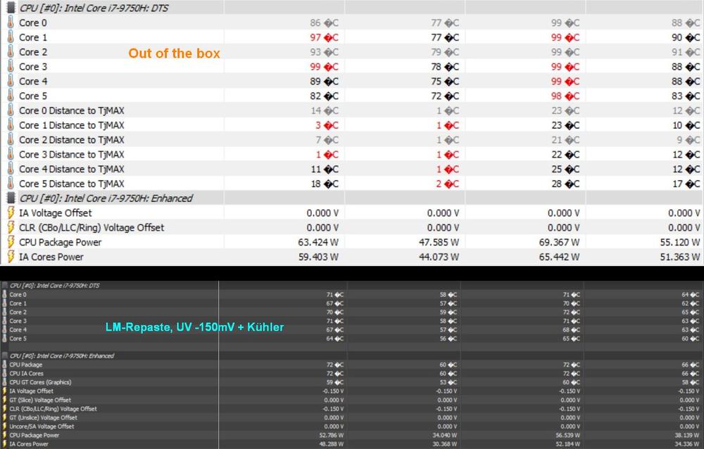 Hallo! Leider hab ich dies bezüglich nichts im Forum gefunden... ...Gibt es denn irgendeine Möglichkeit die CPU dauerhaft zu untervolten?... möchte gerne von den erhöhten Temperaturen runter kommen da das Book dauerhaft auf 3,8-4ghz taktet (94 Grad bis 100 Grad). Throttlestop müsste man ja nach jeden Start wieder neu anmachen usw. Außerdem hab ich entdeckt das die CPU im Stromsparmodus bis maximal ca 3ghz hochgeht aber der PC während des zockens öfter ruckelt. Wenn ich allerdings auf ausbalanciert schalte und die CPU Leistung (in den Windows Energieoptionen) manuell auf maximal 99% (2,5ghz) schalte passiert dies jedoch nicht. In beiden fällen verhalten sich die Temperaturen ähnlich (ca maximal 72 Grad). Habt ihr irgendeinen Rat für mich? Repasten kann ich leider nicht da ich mir das ganze zerlegen des Books nicht zutraue. lg. Stefan -