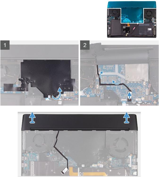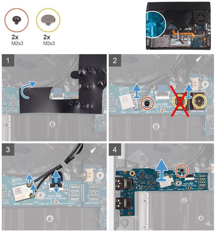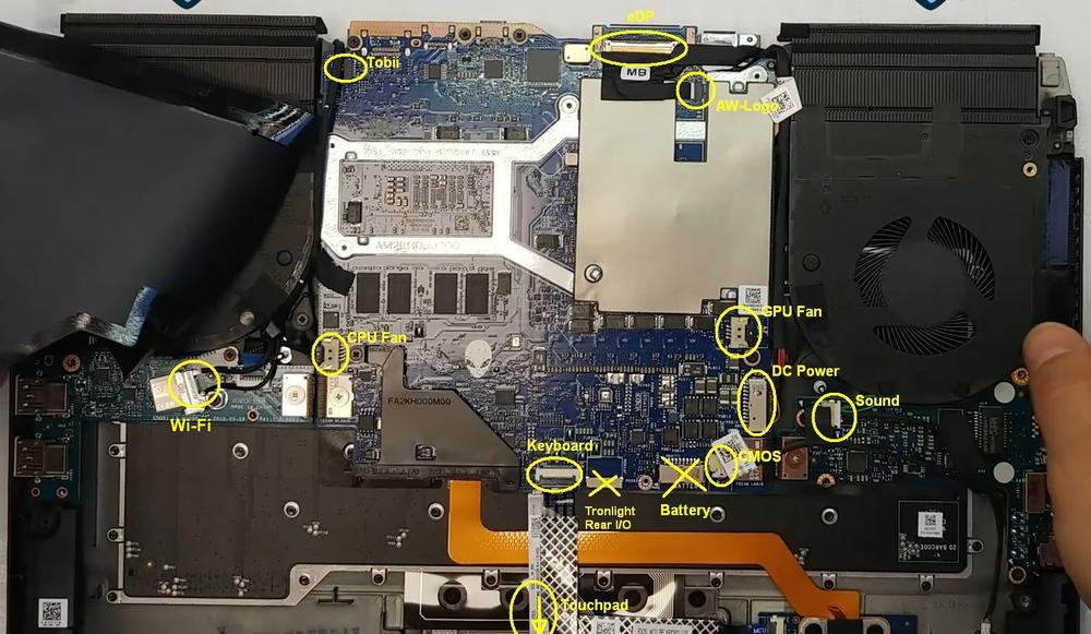 Wie immer, falls ihr es selber macht, ist das ganze auf eigenes Risiko. Ich übernehme keine Haftung oder Verantwortung. Vielmehr dient der Guide als Hilfestellung und Wissenserweiterung. Detaillierte Informationen zu den Sicherheitsbestimmungen findet ihr im Dokumentationsbereich Alienware m15 R2 von Dell. Die hier genannten Schritte zeigen nur eine Möglichkeit wie man es machen kann und weichen an bestimmten Stellen von dem offiziellen Service-Manual ab. Ebenso ist auch nicht jede kleinste Information bis ins Detail erklärt. Daher Augen auf machen und Kopf einschalten, falls ihr es selbst macht. 1. Vorbereitung Zum Thema richtiges Werkzeug, richtige Vorbereitung und spezielle Demontage-Hinweise, verweise ich auf den -Area 51m Repaste-Guide-. Dort steht noch mal alles wichtige detailliert drin. 2. Demontage Wie immer geht's mit der Bodenplatte los. Die vier vorderen Schrauben kann man nur lösen, aber nicht entnehmen. Durch einen Sicherungsring werden sie in der Bodenplatte gehalten. Hat man die gezeigten Schrauben gelöst, kann man die Platte vorne anheben und dann entsprechend rausziehen. An der Stelle empfiehlt sich auch gleich die beiden Schrauben am Rear I/O Panel zu lösen. Nach dem Öffnen der Bodenplatte kommt wie immer das Batterie-Kabel zuerst. Danach folgen die SSDs. An dieser Stelle kann man auch gleich die schwarze Plastik-Klammer ausbauen, die die SSD-Kühlkörper hält. (Bild folgt später). Anschließend wird das TronLight-Kabel des Rear I/O Panels entfernt und das Panel entnommen. Die schwarze Schutzfolie kann nach Entnahme des Panels ebenfalls entfernt werden. Als nächstes kann der Akku raus. Nach dem Ausbau des Akkus empfiehlt Dell die CMOS-Batterie auszubauen. Ich mache das aus den im Link genannten Gründen nicht. Das muss jeder für sich selbst entscheiden. Daher führe ich den Schritt nur optional auf. Anschließend geht's weiter mit den Kabeln. Bei der WLAN-Karte muss vorher die Schutzklammer entfernt werden (2). Achtet beim Herausziehen der WLAN-Antennen, dass ihr die Stecker möglichst gerade nach oben herauszieht, um etwaige Schäden am Mittelpin zu vermeiden (3). Der eDP-Stecker hat wie immer einen Sicherheitsbügel, der zunächst hochgeklappt werden muss, bevor man den Stecker vorsichtig nach hinten rauszieht (4). Das Tronlight-Kabel von AW-Kopf kann auch gelöst werden (4). Was in dem Manual leider nicht gezeigt wird ist das Lösen des Tobii-Eyetracking Kabel. Dieses Kabel liegt ziemlich weit oben, neben den WLAN-Antennenkabeln. Ein Bild, wo genau sich der Stecker aufhält, folgt später noch mal. Falls es noch nicht geschehen ist, sollte man spätestens jetzt die schwarze SSD-Halteklammer entfernen. Tastatur-Flachbandkabel kann man an der Stelle auch gleich machen (Bügel hoch, Kabel raus). Ebenso auch das DC-Power Kabel. CMOS ist wie gesagt nur optional. Anschließend kommen die E/A Platinen. Die linke Platine hat das Powerknopf-Flachbandkabel, die WLAN-Antennen, eine Befestigungsschraube und das Verbindungsstück. Dieses Verbindungsstück hat auf der Unterseite sehr viele Pins und sollte sehr vorsichtig behandelt werden. Daher wird nur die Seite auf dem Maiboard gelöst. Die andere Seite verbleibt in der Platine, auch wenn Dell hier was anderes empfiehlt. Selbiges gilt auch für den Einbau. Bei der rechten Seite hat die Platine das Sound-Kabel, zwei Befestigungsschrauben und das Verbindungsstück. Auch hier wird nur die Mainboard-Seite gelöst, die andere Seite verbleibt in der Platine. Nun folgen die letzten Kabel. In diesem Bild sieht man noch mal alle Kabel im Überblick, da man schnell ein Kabel übersehen kann. Hier ist auch die Position des Tobii-Eyetracking Kabel aufgeführt. Die beiden durchgestrichenen Stecker (Battery & Tronlight) sollten/ können zu diesem Zeitpunkt nicht mehr eingebaut sein, deshalb das X. Die beiden Lüfterkabel können an der Stelle nun auch gelöst werden. Wie bereits beschrieben wird das Flachbandkabel der Tastatur am Mainboard gelöst. Das Touchpad-Kabel wird jedoch an der Tochter-Platine gelöst, da sich hier der mainboard-seitige Stecker auf der Unterseite befindet. Noch ein Hinweis: das Touchpad-Kabel ist am Boden leicht festgeklebt. Das sollte man vorher lösen, bevor man das Mainboard samt Kabel ausbaut. Hat man alle Kabel entfernt, kann das Mainboard entnommen werden. Das Mainboard geht ganz leicht ohne Widerstand raus. Daher vorsichtig und langsam das Mainboard entnehmen. Sollte das Mainboard irgendwo klemmen oder schwer rausgehen, lieber nochmal ablegen und überprüfen. Nicht das noch ein Kabel vergessen wurde. Alternativ kann man die Lüfterkabel auch an dieser Stelle erst lösen. Funfact am Rande, Dell führt in ihrem Service-Manual völlig verdrehte Schrauben auf (siehe Bild). So sollten die Schrauben bei euch natürlich nicht aussehen, daher verweise ich noch mal auf den Punkt 1 mit der Vorbereitung und vernünftigem Werkzeug. Die Heatsink löst man am besten immer über Kreuz und nach und nach. Selbiges gilt auch für den Zusammenbau später. 3. Repaste mit Liquid Metal (LM) Da in so einem flachen Notebook mit so viel Power die Kühlung relativ begrenzt ist, wurde der Repaste nach dem bewährten Verfahren mit LM und dem Auslaufschutz durchgeführt. Wie immer kam Kapton-Tape anstatt des dicken Scotch-Tapes zum Einsatz. Insbesondere da der DIE der CPU sehr flach ist, vermeidet man mit Überlappung von dünnen Kapton-Tape über die Höhe des DIEs zu kommen. Außerdem hat Kapton-Tape noch weitere Eigenschaften, die von Vorteil sind und perfekt für diesen Einsatzzweck geeignet ist (kurzes Video). Überraschenderweise sahen die meisten Wärmeleitpads gar nicht mal so schlecht aus. Ich habe bei diesem Notebook nur die Pads getauscht, die zu stark platt gedrückt waren (guter Indikator auf falsche Stärke) und die, die keinen Kontakt scheinbar hatten. Das waren die Pads für die VRAM-Kühlung. Beim PCH habe ich das Pad ebenfalls entfernt. Das Kühlplättchen habe ich ein wenig runtergebogen und Wärmeleitpaste 