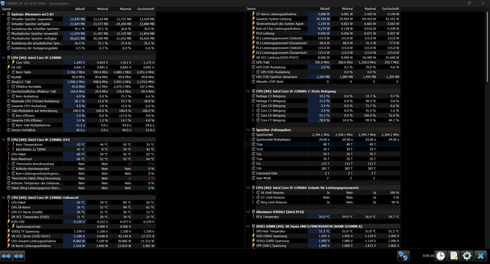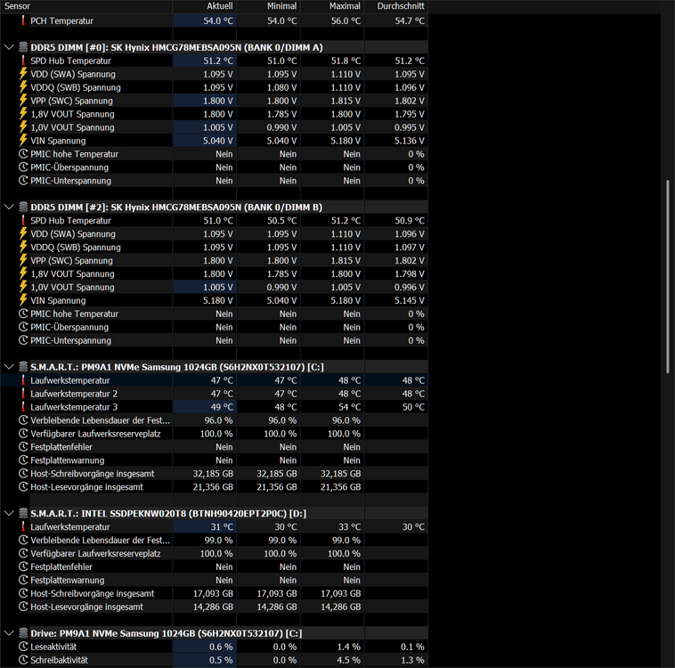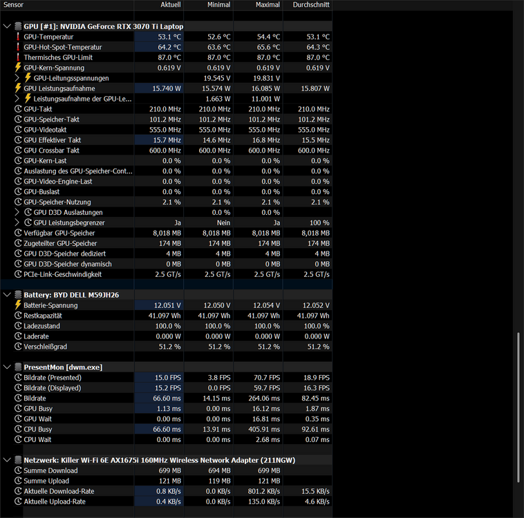 Moin zusammen, seit längerem habe ich das Problem, dass meine Aliens (zuvor m15r3, jetzt m15r7) alles andere als "Akkuwunder" sind. Das mag zwar zu erwarten sein, aber es gab zeiten, da habe ich die Geräte auf 12-20W idle-Stromverbrauch gehabt, was völlig ok ist. Mein m15r7 allerdings genehmigt sich knappe 50W, während laut HWinfo die CPU und GPU keinen nennenswert hohen Verbrauch haben. Offenbar gibt es einen Verbraucher, der in HWinfo nicht namentlich aufgelistet wird, jedoch zumindest in der Gesamt-Systemleistung bzw Discharge-Rate beim Akku (dessen Wear level vermutlich dadurch bereits nach 1,5 Jahren auf über 50% gekommen ist, Gerät ist halt mindestens warm.... Lüfter sind übrigens flüsterleise im Officebetrieb). Hat da jemand zufälligerweise eine Idee? Gerät aufmachen, Wärmebildkamera? Andere Software? Bios/Windows ist vollständig durchgepatcht und auf aktuellstem Stand. Höchstens für die SSD könnte es noch was geben, da hab ich aktiv nie nach gesehen, ob es da irgendwelche Firmwareupgrades gibt. Zufälligerweise Ideen, was man außer Windows-Neuinstallieren und hoffen, dass sich das System danach nicht schon wieder "verirrt", machen kann? Viele Grüße