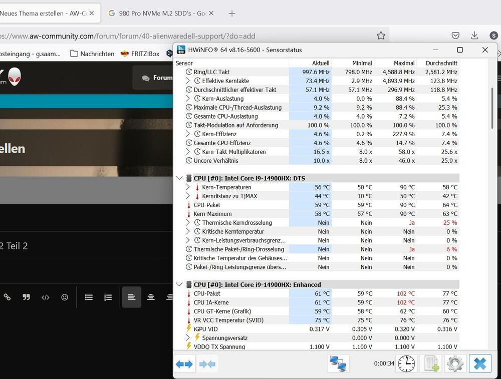 Moin zusamn Habe den neuen AW m18R2 kurz vor Weihnachten erhalten. Ist das normal, wenn die Lüfter heute nach 2 min im normalen Betrieb (Office, Firefox, u.s.w.) volle Leistung anspringen? Habe die HWinfo gestartet und habe das im anhängenden Bild gesehen. Das ist doch nicht normal. Am 25.12. habe ich etwas WoW gespielt, vielleicht eine viertel Stunde, musste dann aufhören, weil die Temperatur im Durchschnitt 100° anzeigte. Lt. HWInfo und AW Command Center. Der Laptop steht auf einem Laptop Kühler. Gruß Sammy -