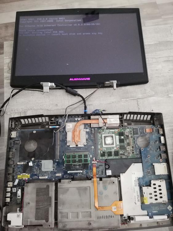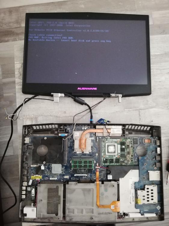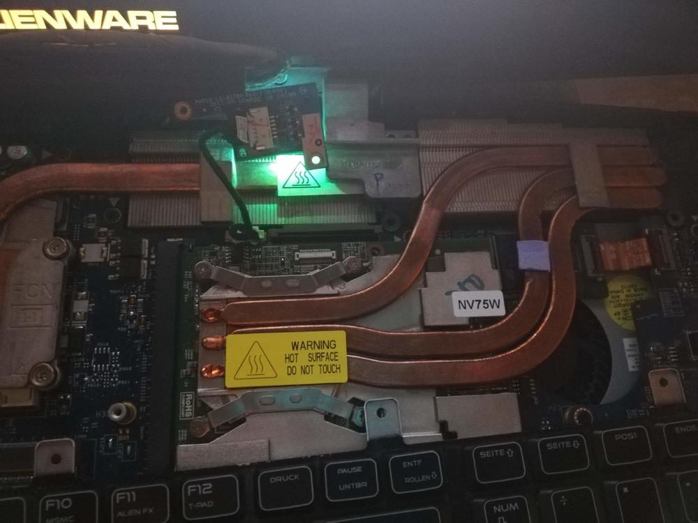 Hallo. Habe von meinem Bruder mein altes m18x wieder bekommen da es nur 1x piept und nicht angeht. Bin jetzt am verzweifeln da ich nicht weis ob es nun die Grafigkarte oder Mainboard ist. Hab folgendes unternommen. die Neue G Karte in den 2. bzw SLI slot geschoben. so Notebook ging an aber nur mit Interner NVIDIA , logisch. Dann im Bios auf interne Grafik umgestellt. ( Kühlkörper von der GPU ist mer kaputt gegangen durch unvorsicht ) Hab nun Kühlkörper von GPU und gleich für SLI bestellt und eine neue 850m Grafigkarte ( mehr lässt Geldbeutel grad net zu und zum testen langt des ) So neue G Karte eingebaut das X Bracket hab ich von der Alten Karte übernommen. Paste drauf neuen GPU Kühlkörper ( der neue soll eig. in ein m18x passen kommt mer aber globiger vor und ging auch etwas schwer aper passt nun ) Lüfter hab ich alle erneuert den für SLI hab ich auch gleich mit eingebaut. Akku wurde auch neuer gekauft und eine Samsung 850 Evo 500GB verbaut Beim einschalten ist folgendes aufgefallen . Zieh ich die Schrauben vom Kühlkörper am X bracket fest Flimmert Bildschirm rot ( Hab im bios auch bei Grafik wahl auf automatisch umgestellt ). Zieh ich die Schrauben etwas lockerer so läuft alles prima. Die 2. G Karte war leider eine Fehlbestellung hab net gesehen dass die einkerbungen da fehlen und die zwar aus einem MSI stammen nur wird die auch schon garnet erkann. Verkauf se also weiter. Das SLI kabel ist noch in China und kommt i.wann anfang Januar. Betreibe ihn also mit einer 850m momentan noch mit 10GB Arbeitspeicher Hab Windows 10 installiert alle Treiber drauf. Karte wird auch erkannt. Hab sogar Benchmark grad laufen lassen und soweit alles normal. Ursprünglicher Fehler 1 Video Video 2 Nun weiß ich nicht ob es das Board oder doch die Karte war oder sogar beides. In den Anhängen Bilder vom zerlegten Zustand mit umgesteckter Karte. Auf dem Bild mit den Temperaturen das ist aktuell von heute