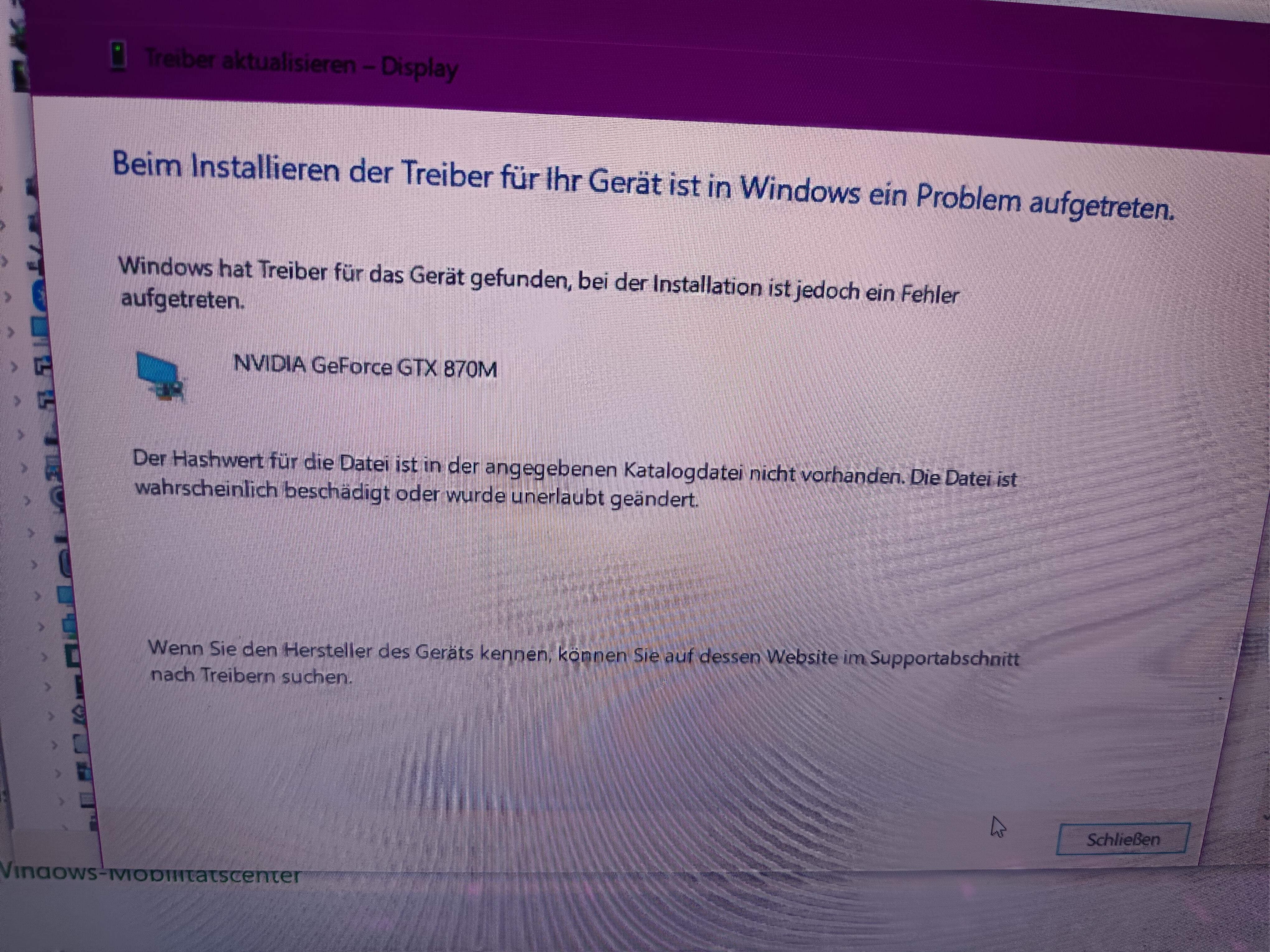 Grüße, bin neu und starte mit "alter" Hardware und neuen Problemen. (aus meiner Sicht..) Ich besitze seit zwei Jahren einen M18X (ich glaube r1, aber ich weis nicht wie ich erkenne ob r1 oder r2) Gebraucht über Kleinanzeigen gekauft, leider ohne Grafikkarte(n). Nun bot sich die Gelegenheit zwei GTX870m zu bekommen, hab natürlich zugeschlagen. Kühlkörper besorgt, Laptop Zerlegt, Eingebaut. Problem 1: SLI Kabel hat andere Stecker als die Grafikkarten. (Welches Kabel Passt denn?) Ok. Also erstmal ohne zusammengebaut. Problem 2: Kann keine Treiber installieren. Im Bios werden beide Karten korrekt erkannt (als GeForce gtx) Windows nennt sie aber "Microsoft Basic Display Adapter" Treiber von nvidia installieren schlägt fehl. Also Google, dieses Forum gefunden und einen Beitrag aus 2014 in dem Super erklärt wird wie man den Treiber Modifizieren kann (aw-community.com/forum/topic/5080-treiber-von-nvidia-modifizieren) Leider hat das nicht funktioniert. Das Modifizieren wohl schon, weil ich nicht mehr bei der Systemprüfung einen Fehler bekam, sondern das Installieren Starten konnte, aber das eben auch abbrach mit "Treiber Fehler" der nicht näher benannt wird. installieren über den Gerätemanager brachte auch einen Fehler (Siehe Bild) Hashwert fehlt im Katalog, Allerdings wurde sie dann erstmals richtig erkannt. Erneutes Aktualisieren der Treiber benannte die Karten wieder in das vorherige "Microsoft Basic Display Adapter" um... Soweit so unklar. Komme leider nicht weiter. Vielleicht hat ja jemand die Passende Idee. recht herzlichen Dank fürs Lesen und eventuell Gedanken machen.