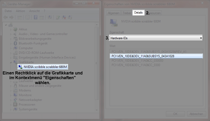 Da es gerade bei bastellustigen Alienwarebenutzern immer wieder dazu kommt, dass Grafikkarten in Notebooks verbaut werden die Dell nicht nativ angeboten hatte, werden Änderungen notwendig um den Treiber von nVidia installieren zu können. Fast genauso häufig wie dieser Treiber benötigt wird ist auch die Frage danach wie man den Treiber anpasst. Fangen wir jedoch einen Schritt vorher an. Wieso muss ein passender Treiber überhaupt erst manuell angepasst werden um installiert zu werden? Hier liegt die Verantwortung bei nVidia und deren Hardwareerkennung. Der Treiber kontrolliert leider nicht nur die HardwareID der Grafikkarte sondern die Kombination aus Notebook und Karte. Wenn nun eine dieser Kombinationen vom Hersteller, in unserem Fall Dell, nicht an nVidia gemeldet wurde taucht die ID nicht in der Erkennung auf. Und genau hier setzen wir nun an und holen dies nach. -Wie ist die HardwareID aufgebaut? -Welche Datei muss ich ändern? -Welche Änderungen müssen vorgenommen werden? -Muss ich sonst noch etwas beachten? Wie ist die HardwareID aufgebaut? Die Hardware-ID der Grafikkarte finden wir im Geräte-Manager. Wenn noch kein Treiber installiert ist heißt unsere Grafikkarte dort "Standart-VGA", "Microsoft-Standart-Anzeigegerät" oder ähnliches. Dieser Name ändert sich später durch den Treiber. Um dieses Tutorial möglichst leicht verständlich und nachvollziehbar zu gestallten ist es nicht unwichtig zu wissen wie die benötigte HardwareID aufgebaut ist. Nehmen wir uns als Beispiel eine GTX680m in einem M17xR2. PCI\VEN_10DE&DEV_11A0&SUBSYS_043A1028 VEN_10DE = nVidia DEV_11A0 = GTX 680M 043A = M17xR2 1028 = Dell Welche Datei muss ich ändern? Nachdem wir versucht haben den neuen Treiber von nVidia zu installieren und dieser Versuch abgebrochen wurde findet sich der bereits entpackte Treiber auf der Festplatte, meist unter C:\NVIDIA\DisplayDriver\VERSION\Win8_WinVista_Win7_64\International\Display.Driver\ In diesem Ordner befinden sich u.a. folgende INF-Dateien. nvaci.inf Acer, Gateway nvami.inf Asus nvaoi.inf Apple nvbli.inf HP nvcti.inf Compal nvcvi.inf Clevo nvdmi.inf Dell nvfmi.inf Fujitsu nvfui.inf Siemens nvhmi.inf HP nvloi.inf LG nvlti.inf Lenovo nvmi.inf MSI nvqni.inf NEC nvszci.inf Sony nvtdi.inf Toshiba Qosmio nvtsi.inf Toshiba Welche Datei hiervon wir nun ändern ist prizipiell egal, denn bei der Installation werden ohnehin alle Dateien nach einer passenden HardwareID durchforstet. Der Ordnung halber verwende ich jedoch die "nvdmi.inf". Welche Änderungen müssen vorgenommen werden? Kommen wir nun zum Kernthema. Es sind nur zwei Zeilen die wir der Datei hinzufügen müssen. Die erste Zeile sagt dem Treiber, dass unsere HardwareID kompatibel ist. Um die Stelle der ersten Änderung zu finden ist es wichtig zu wissen welches Betriebssystem verwendet wird. Sucht jeweils die Zeile die zu eurem OS passt. 1.1 Vista [NVIDIA_SetA_Devices.NTamd64.6.0] 1.2 Win7 [NVIDIA_SetA_Devices.NTamd64.6.1] 1.3 Win8 [NVIDIA_SetA_Devices.NTamd64.6.2] 1.4 Win8.1 [NVIDIA_SetA_Devices.NTamd64.6.3] In der Zeile darunter tragen wir nun folgendes ein: %NVIDIA_DEV.11A0.043A.1028% = Section033, PCI\VEN_10DE&DEV_11A0&SUBSYS_043A1028 Natürlich müsst ihr diese Zeile euerer HardwareID entsprechend anpassen. Die zweite Zeile die wir ändern sagt dem Treiber wie er die Karte anschließend benennen soll. Sucht die folgende Zeilen (OS ist dieses mal egal): DiskID1 = "NVIDIA Windows (64 bit) Driver Library Installation Disk 1" NVIDIA = "NVIDIA" NVIDIA_A = "NVIDIA" In der Zeile darunter tragen wir nun unsere Karte ein. In unserem Beispiel wäre dies: NVIDIA_DEV.11A0.043A.1028 = "NVIDIA Tuschkasten GTX 680M" Auch diese Zeile muss etsprechend eurer HardwareID angepasst werden. Anschließend müssen wir nur noch die Datei speichern und die Installation neu starten. Hierzu folgende Datei ausführen: C:\NVIDIA\DisplayDriver\VERSION\Win8_WinVista_Win7_64\International\setup.exe Muss ich sonst noch etwas beachten? Da der Treiber nun modifiziert ist stimmt er nicht mehr mit der digitalen Signatur überein. Bei Vista und Win7 ist dies nicht weiter schlimm. Hier muss man nur bestätigen, dass der Treiber dennoch installiert werden soll. Ab Win8 hingegen muss zuerst die Installation von nicht signierten Treibern zugelassen werden. Hierzu die Eingabeaufforderung öffnen (WinTaste+X) und folgendes eingeben: bcdedit /set {current} testsigning yes Danch Windows neu starten und den Treiber installieren. Um die Installation nicht signierter Treiber wieder zu unterbinden erneut die Eingabeaufforderung öffnen und folgendes eingeben: bcdedit /set {current} testsigning no Auch diese Änderung wird erst nach einem Neustart wirksam.- 87 Antworten