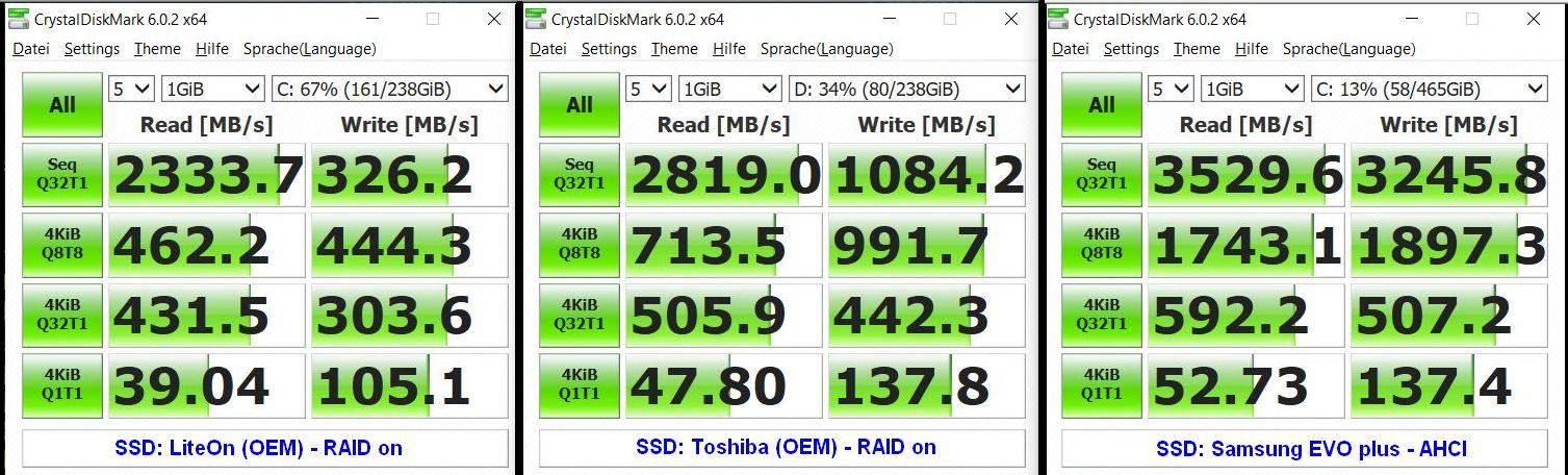 Durch die vielen Repastes ist mir schon häufiger aufgefallen, dass User, obwohl sie NVMe SSDs wie die Samsung 970 Evo plus verbaut haben, im standardmäßigen "RAID on" Modus unterwegs sind. Für PCIe NVMe SSDs ist der richtige Modus aber AHCI. Für diejenigen, die nicht genau wissen worum es geht, es ist im BIOS eine auswählbare Funktion wie die Speichercontroller angesprochen werden und mit dem Chipsatz/ System kommunizieren. Natürlich funktionieren die NVMe SSDs auch im RAID on Modus, jedoch sind hier dann einige Funktionen eingeschränkt oder stehen nicht zur Verfügung. Beispielsweise lässt sich die SSD nicht mit den herstellereigenen Tools öffnen und verwalten (Samsung Magician). Auch lässt sich der dazugehörige NVMe Treiber nicht installieren. Die Festplatte läuft dann auf einem Standard-Intel RST Treiber. Das lässt sich relativ einfach im Geräte-Manager nachprüfen: Da ich vor einiger Zeit zwei m15 hier hatte, habe ich ChrystalDiskMark durchlaufen lassen. Dabei war das Testgerät im RAID on Modus und hatte zwei NVMe SSDs verbaut. Mein Gerät ist im AHCI Modus und hat zwei Samsung 970 EVO Plus SSDs verbaut. So sehen die Ergebnisse aus: Gerade bei den Schreibgeschwindigkeiten ist der Unterschied doch schon enorm. Fairerweise muss aber auch sagen, dass das Testgerät mit den von Dell verbauten SSDs daherkam. Ich habe diese als OEM deklariert. Was mich jetzt brennend interessiert: wie performt die Samsung 970 SSD im RAID on Modus? Würde mich freuen wenn das jemand abchecken und online stellen könnte. Danke Ich hatte versucht Informationen dazu zu finden, aber wirklich verlässliche Infos habe leider nicht gefunden. Im XPS-Forum wurde wohl was von ca. 5% Leistungsverlust gesprochen, wobei der Beitrag auch schon mehrere Jahr alt ist. Samsung empfiehlt jedenfalls AHCI um den vollen Funktions- und Leistungsumfang nutzen zu können. Vor allem die volle Schreib- und Leseleistung soll nur mit dem Samsung NVMe Treiber möglich sein. Noch ein paar Anmerkungen: Hat man sein OS im RAID on Modus laufen, kann man nicht einfach auf AHCI wechseln. Das OS, welches im RAID on Modus installiert wurde, lässt sich dann nicht mehr booten. Möchte man AHCI nutzen, ist leider dafür eine Neuinstallation nötig. Den ChrystalDiskMark findet ihr -HIER-. Wie gesagt, würde mich freuen, wenn einer, der die Samsung 970 EVO Plus verbaut hat und im RAID on Modus ist, einen kurzen CrystalDiskMark durchlaufen lassen könnte. Einfach installieren und ausführen, keine weiteren Einstellungen nötig. Bin gespannt wie klein oder groß der Unterschied ausfällt.