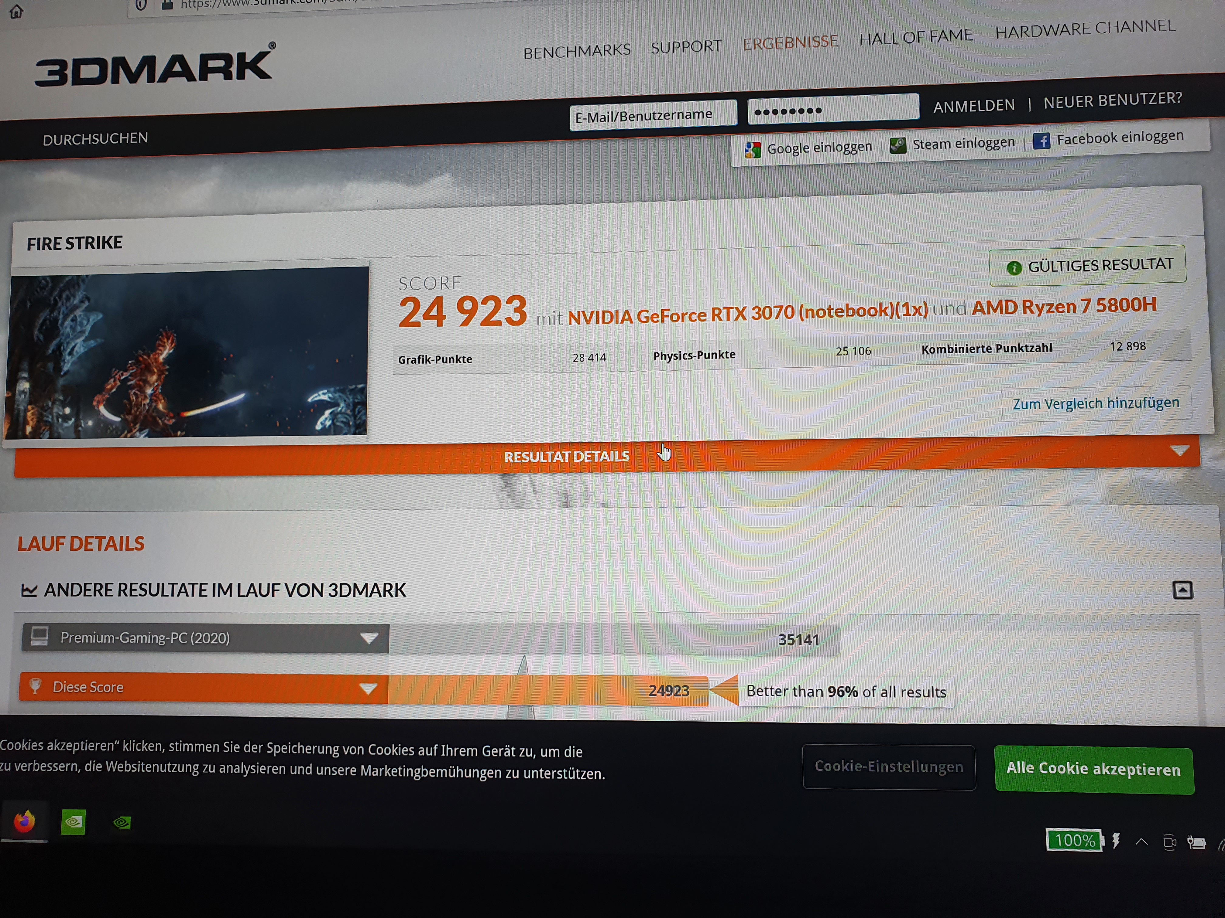 Mit meinem Alienware R4 habe ich die Punkte nicht erreicht.  Da sieht man was die AMD CPU doch für ein Gewinn macht gegenüber der Intel 10ner Reihe. Die RTX3070 ist wirklich fast so schnell wie die RTX3080 im Alienware. Ich hatte mit dem R4 die 24000 Punkte aber hier fast 25000 Punkte im Firestrike. CPU max 81 Grad GPU MAX 71 Grad .  Aber OHNE LM Repaste macht das book halb soviel spaß.  Habe es jetzt ca 2 Wochen und bin immer noch begeistert.