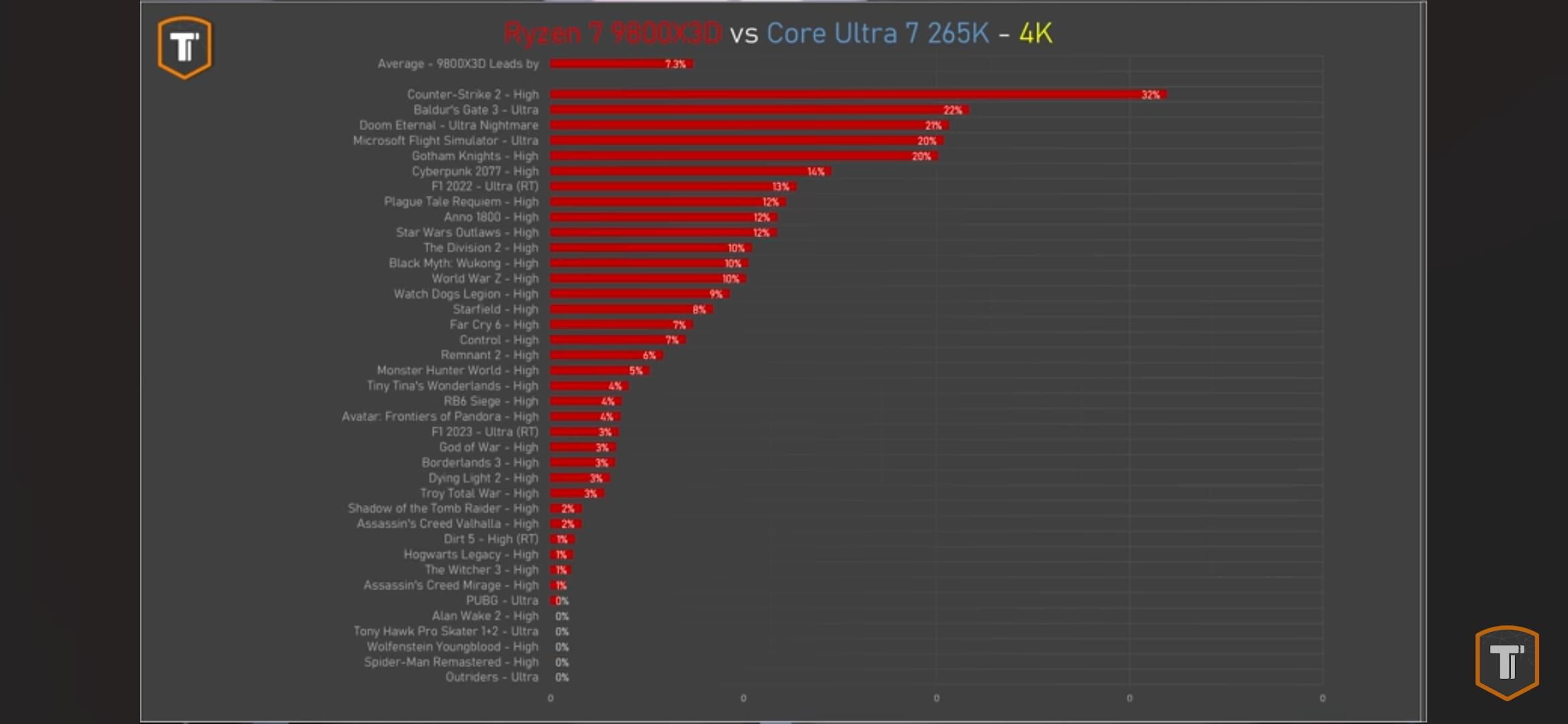 Im PCGH Retest sieht man gut, dass die CPU mit Zen 4x3d mithalten kann. Und wie gesagt, RAM macht ne Menge aus. Deswegen wird es beim Area 51 auch deutlich langsamer werden. Habe alles jetzt intensiv einen Monat lang getestet. 2 Kumpel von mir sind auf dem 265k unterwegs, rennt auch hervorragend. Und dadurch das wir einen 7800x3d, 9800x3d und 9950x3d in der Zockergruppe zum testen haben, kann man sich dann ein gutes real life Urteil bilden, wenn beide dann den "korrekten" RAM haben. FHD Gaming merkt man den Unterschied, bei allem drüber: nicht der Rede wert. Muss dann jeder selbst wissen wie hoch der FHD Anteil ist und ob es das extra Geld dann wert ist. 550€ für 8 Kerne ist wirklich übertrieben.