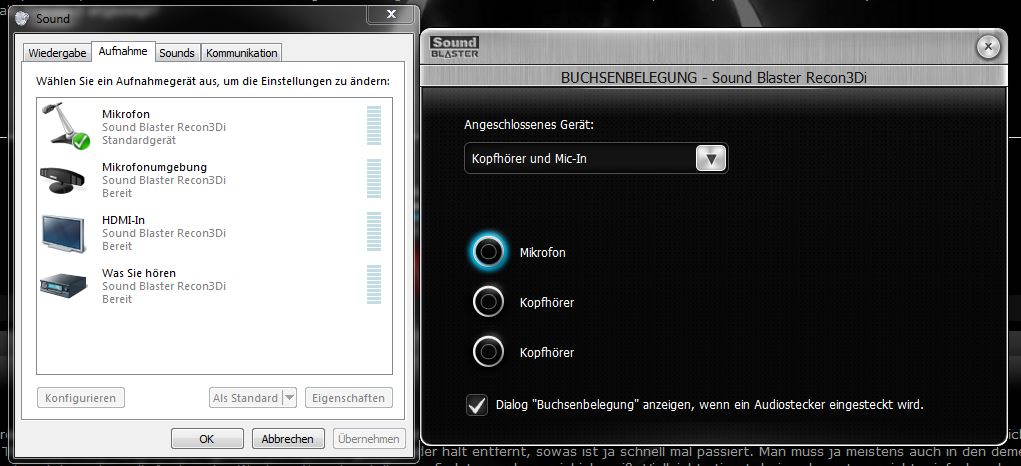 Schließe ich Mikrofone an, werden diese korrekt in Puncto Buchse erkannt und in der Soundsteuerung unter Aufnahme aktiviert und als Standard gesetzt und das interne Mikrofon derweil als nicht mehr aktiv geschaltet. (am anderen PC getestet funktionieren die Mikrofone einwandfrei)
