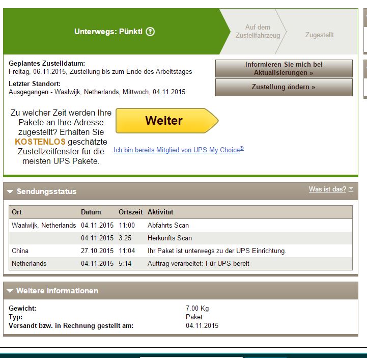 So, das Schiff ist wohl in den Niederlanden eingetroffen, wobei das bestimmt ein Flieger war so schnell wie das ging. Geplante Zustellung 14.10.2015. Da muss ich ja sehen, dass ich auf die schnelle morgen noch frei bekomme.